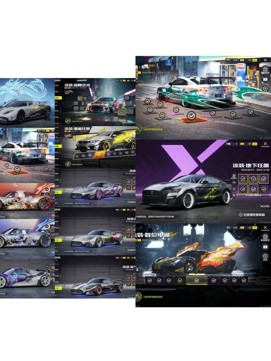 【全金车全紫车】,全部传奇涂装,个性化配件,全部特效潮服,商城贴纸,全部商城涂装,商城改装套件,全部氪金。