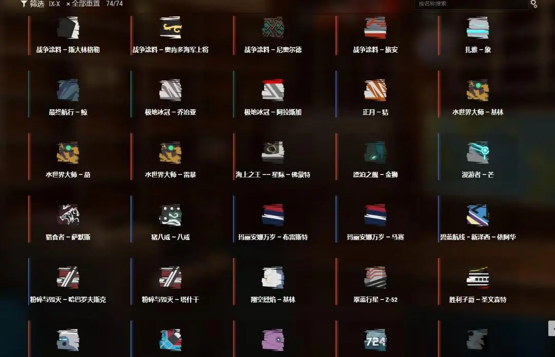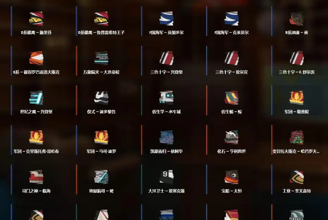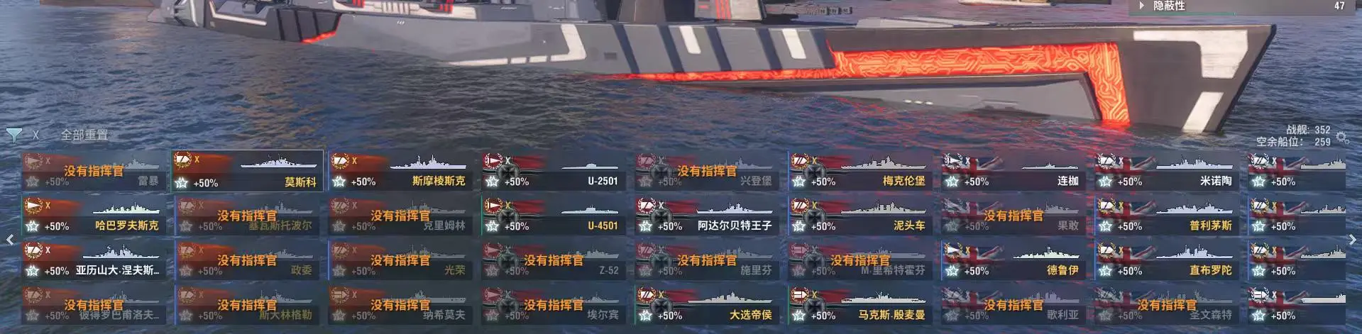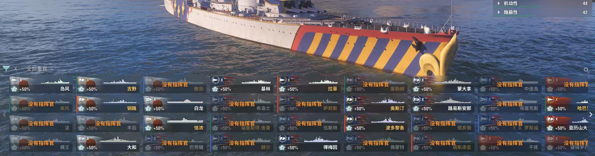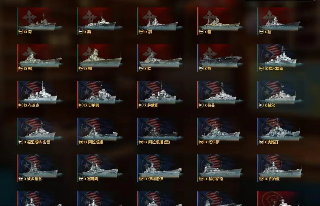 X级战列舰24艘:光荣、大和(蝎子皮)、丰后、敷岛、佛蒙特(金鹰皮、火箭皮)、俄亥俄、威斯康辛、大拿(恐鳄、擎天柱)、路易斯安娜、克里姆林、大选帝候(威震天,太空皮)、施里芬(伴生皮)、普鲁士、梅克伦堡、圣文森特(工业皮、胜利子爵)、征服者(庆典皮、银色漩涡)、无比、雷神、共和国(太空皮、钢索)、勃艮第、劳里亚、哥伦布(军团)、西西里