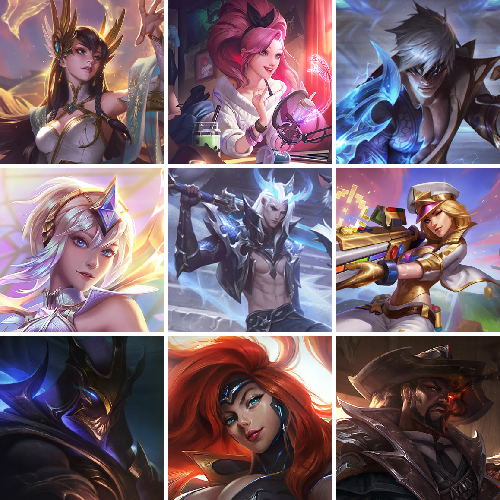 【重要皮肤】墨之影武者亚索至臻 花仙使者卡特琳娜至臻 绝息圣堂厄运小姐至臻 北极星使者沃里克至臻 海珀利安小队X09星环灵风迦娜至臻 神凰行者烈羽焰凰霞至臻 魅惑女巫莫甘娜至臻 女帝黛安娜至臻 战斗学院蕾欧娜至臻 魔女婕拉至臻 魔女乐芙兰至臻 奥术师佐伊至臻 未来战士卢锡安至臻 真实伤害亚索至臻 真实伤害赛娜至臻 灵能特工伊泽瑞尔至臻 福牛守护者菲奥娜至臻 源计划阴劫至臻 王国机神玄武盖伦至臻 神龙尊者炎龙瑟提至臻 征服者贾克斯至臻 飞升战神潘森至臻 KDA二代卡莎至臻 电玩女神凯特琳至臻 绒毛菲兹至臻 绒毛菲兹2022至臻 腥红之月亚托克斯至臻 腥红之月亚托克斯2022至臻 灰烬守护者慎 灰烬骑士莫德凯撒 灰烬骑士派克 灰烬杀手塞拉斯 海克斯科技安妮 海克斯科技雷克顿 海克斯科技斯维因 海克斯科技吉格斯 海克斯科技嘉文四世 海克斯科技魔腾 黎明使者卡尔玛 摄魂使者薇恩 胜利女神娑娜 胜利之王泰达米尔 舞会公主安妮 钢铁军团拉克丝 养蜂人辛吉德 电玩勇者锐雯 玉剑传说舞剑仙 玉剑传说舞龙卫 春晖神女拉克丝 定海神珍孙悟空 紫金罗刹莫甘娜 烈焰美人薇恩 王国机神青龙德莱文 王国机神朱雀蕾欧娜 王国机神苍狼瑟提 王国机神白虎贾克斯 王国机神玄武盖伦 福牛守护者阿利斯塔 胜利机器人布里茨 冬季仙境奥莉安娜 雪球也能爆炸吉格斯 圣诞捣蛋鬼金克丝 冬季仙境卡尔玛 狂心冰王图奇 冰雪女神辛德拉 魄罗骑士瑟庄妮 平安夜女神娑娜 圣诞糖果棒厄运小姐 魅惑女巫厄运小姐 魅惑女巫伊莉丝 死亡誓约维克托 泳池派对辛德拉 泳池派对厄运小姐 泳池派对菲奥娜 泳池派对雷克顿 御星魔矢艾希 制胜金靴李青 EDG佛耶戈 FPX锤石 FPX薇恩 FPX李青 FPX普朗克 FPX墨菲特 SSG纳尔 SSG嘉文四世 SKTT1辛德拉 SKTT1艾克 SKTT1奥拉夫 SKTT1伊莉丝 SKTT1雷克顿 SSW泰隆 SSW图奇 SSW辛吉德 SKTT1婕拉 SKTT1李青 暗杀星努努和威朗普 Fnatic迦娜 Fnatic库奇 Fnatic古拉加斯 Fnatic嘉文四世 Fnatic卡尔萨斯 冰雪节玛尔扎哈 冰雪节辛吉德 冰雪兽纳尔 防暴士兵格雷福斯 防暴天使凯尔 钢铁之翼艾尼维亚 冠军典狱长锤石 冠军之矛卡莉丝塔 冠军之刃锐雯2016 冠军之隐劫 鬼影森森茂凯 鬼影重重魔腾 海贼瑞兹 胡桃夹子萨科 警用试作体K9内瑟斯 密林猎手提莫 南瓜头费德提克 女猎手希维尔 圣诞精灵崔丝塔娜 圣诞开心鬼提莫 圣诞狂欢基兰 圣诞狂欢努努和威朗普 圣诞老人古拉加斯 圣诞玩偶波比 圣诞驯鹿克格莫 糖果使徒费德提克 外星装甲库奇 卧虎藏龙贾克斯 无头骑士赫卡里姆 喜庆之树茂凯 邪恶圣诞老人维迦 雪默丁格 雪球也能爆炸吉格斯 野兽猎人德莱文 野兽猎人瑟庄妮 勇者阿狸 勇者奈德丽 征服者卡尔玛 征服者韦鲁斯 机械迷城加里奥 阿木木主人不要我了 波比的巧克力工坊 十五周年纪念希维尔 十周年纪念安妮 神凰行者瑞羽圣凰艾尼维亚 胜利凤凰艾尼维亚 大元素使拉克丝 武装战姬厄运小姐 KDAALLOUT萨勒芬妮独立音乐人 KDAALLOUT萨勒芬妮明日新星 KDAALLOUT萨勒芬妮超级巨星 绝息圣堂洛