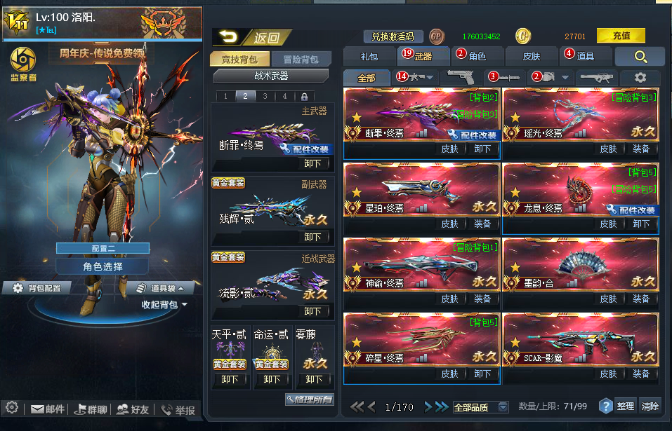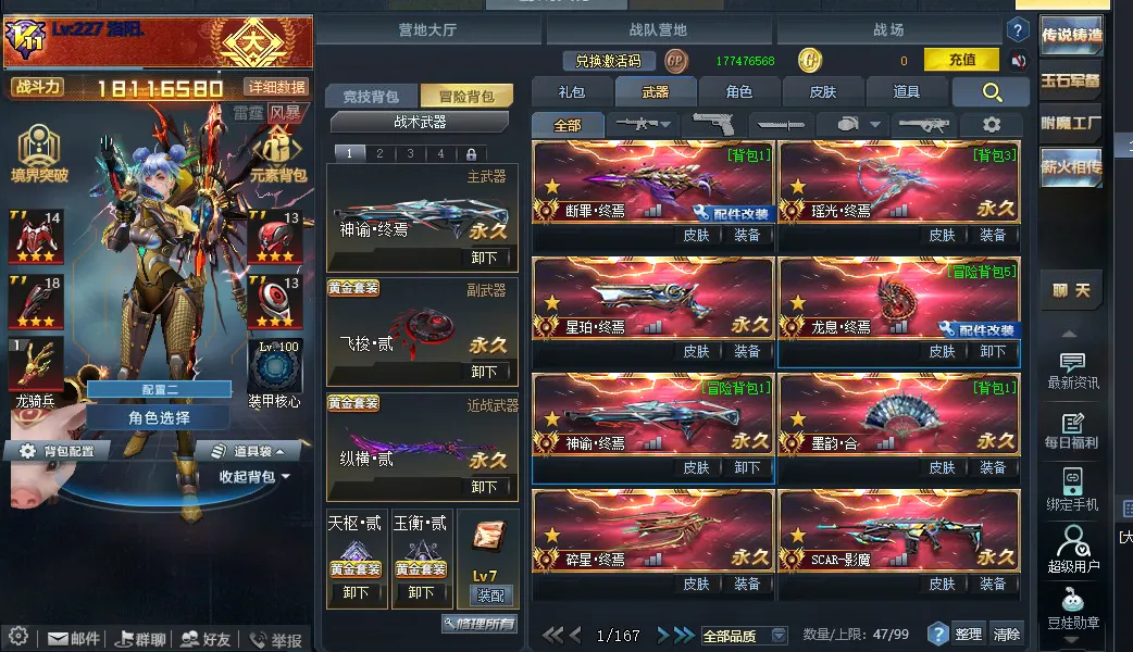 22传说武器:最新传说断罪终焉带皮肤紫黛⭐️万化主宰⭐️瑶光终焉⭐️星伯终焉⭐️龙息终焉满配带皮肤 ⭐️神谕终焉带万象皮 ⭐️碎星终焉带皮 ⭐️墨韵.合 ⭐️无尽光影终焉 ⭐️M4A1无限金蛇皮⭐️屠魔带皮御雷⭐️AK47天神⭐️影魔带皮肤幻晶⭐️RPK天神⭐️RPK主宰⭐️AK主宰