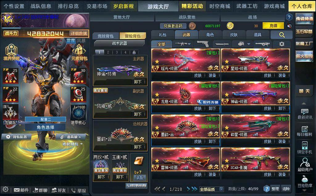 传说武器:星珀终焉◆RPK主宰◆龙息终焉◆神谕终焉◆AK47主宰◆ 墨韵合>碎星.终焉◆雷神终焉◆SCAR-影魔◆无尽光影终焉◆M4A1无限EX◆屠魔◆AK47天神◆