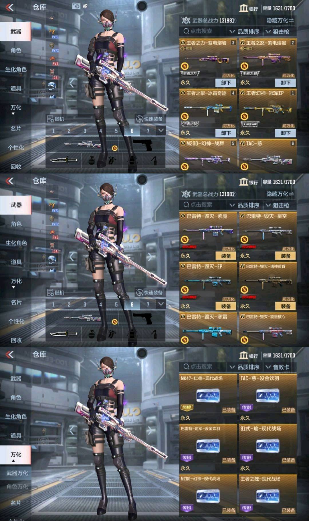 🔥狙击枪:❤🔥王者之怒-紫电熔岩❤🔥王者之怒-拉丝❤🔥王者之怒-冠军LGD❤🔥王者之力-紫电熔岩❤🔥王者幻神-冰霜奇迹❤🔥王者幻神-冠军EP❤🔥王者之掣-冰霜奇迹❤🔥王者之神❤🔥M200-幻神-战舞❤🔥TAC-慈❤🔥巴雷特-定军-一战扬名❤🔥AWM-妙才-过载❤🔥巴雷特-安琪拉❤🔥98K-蜻蜓❤🔥巴雷特15把❤🔥等省略