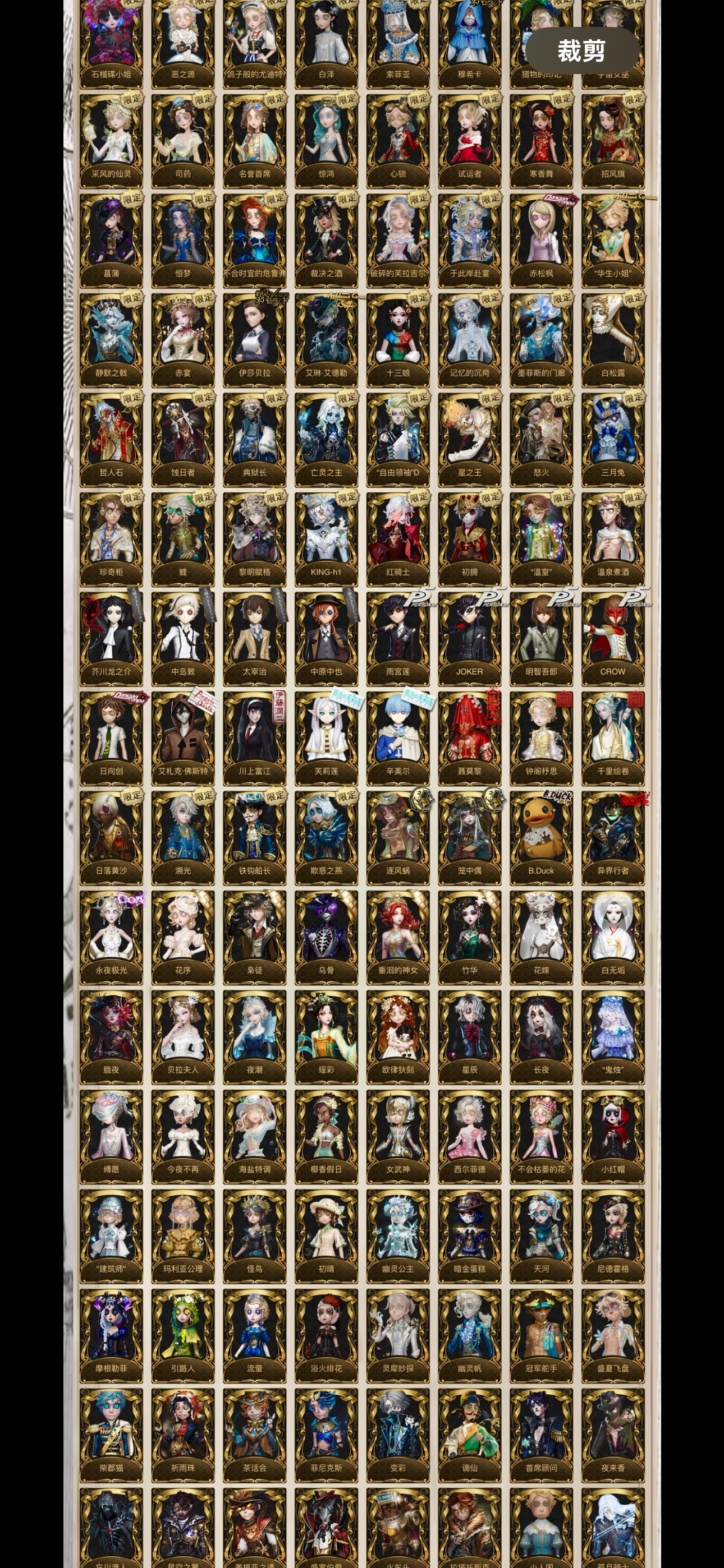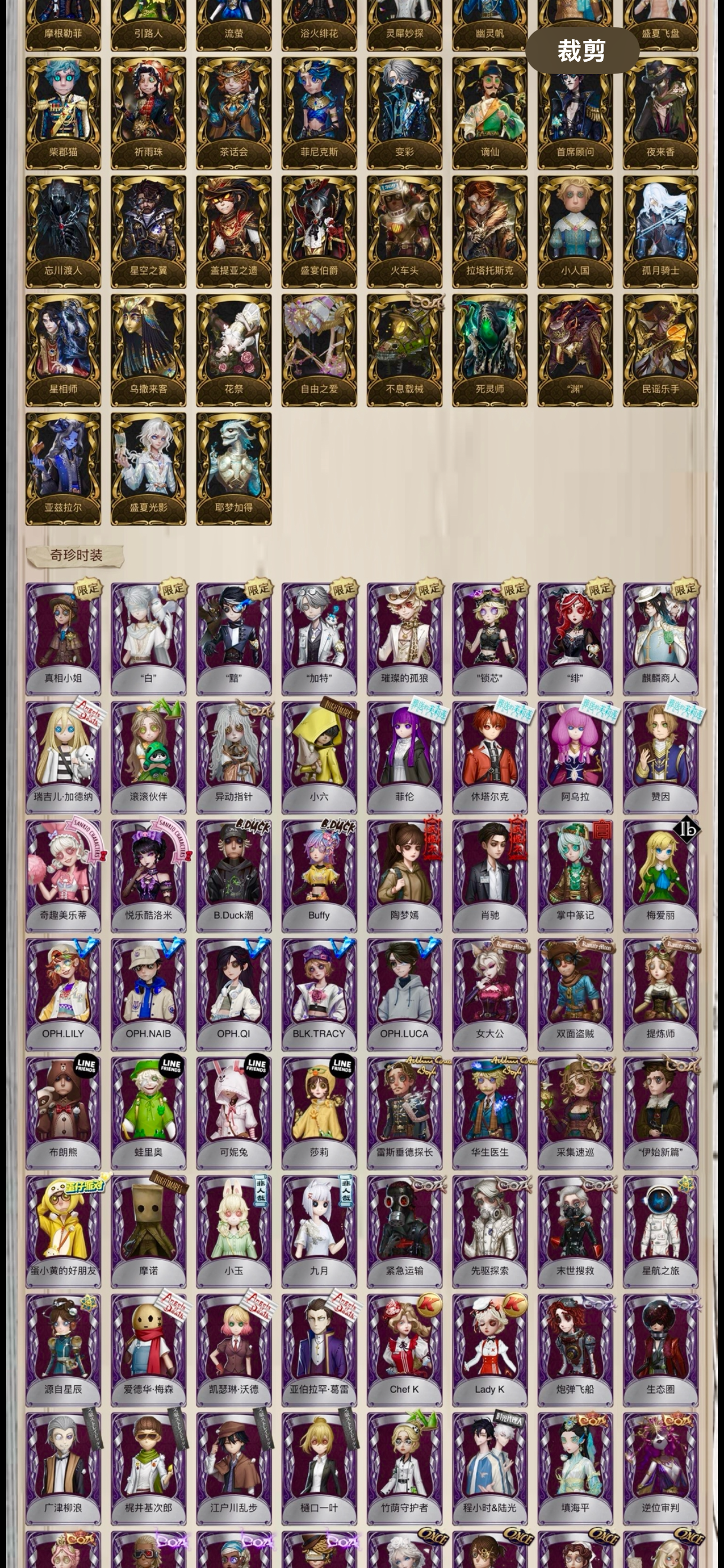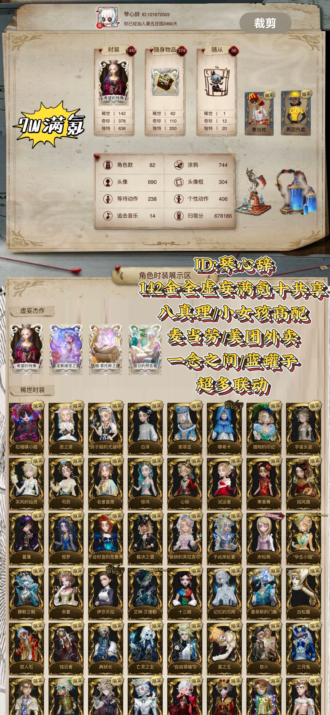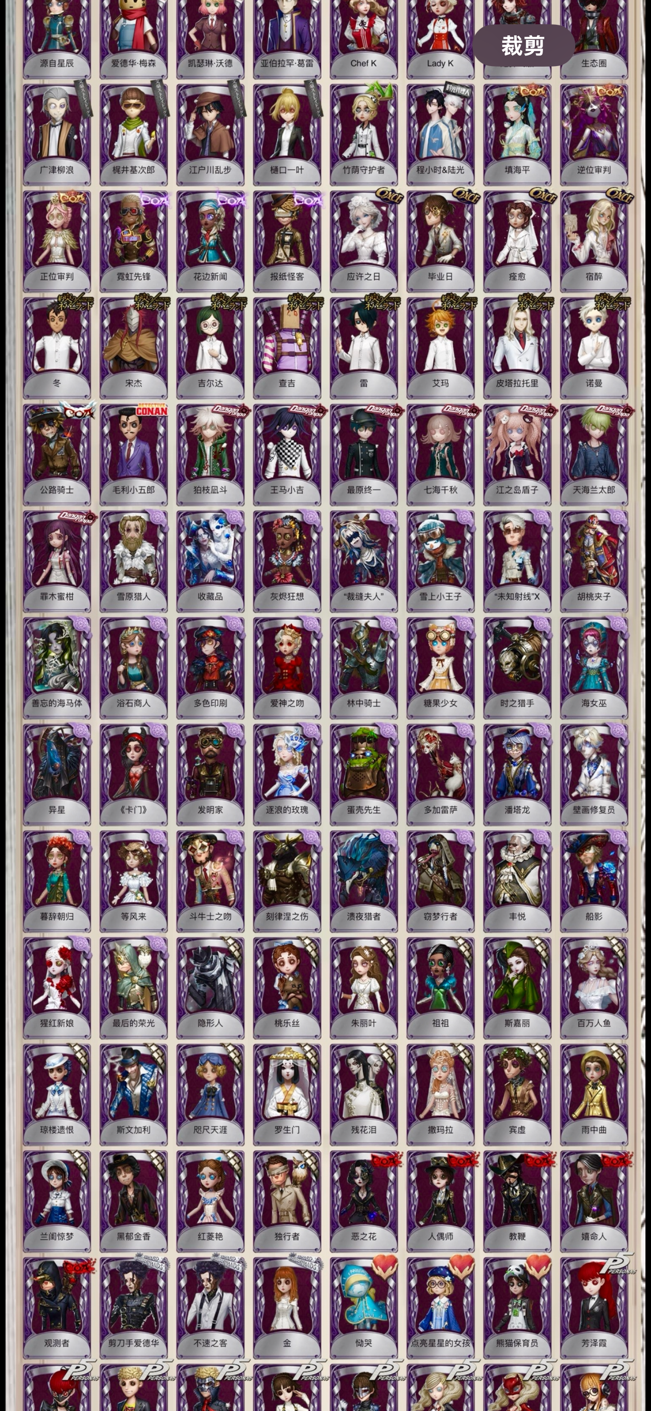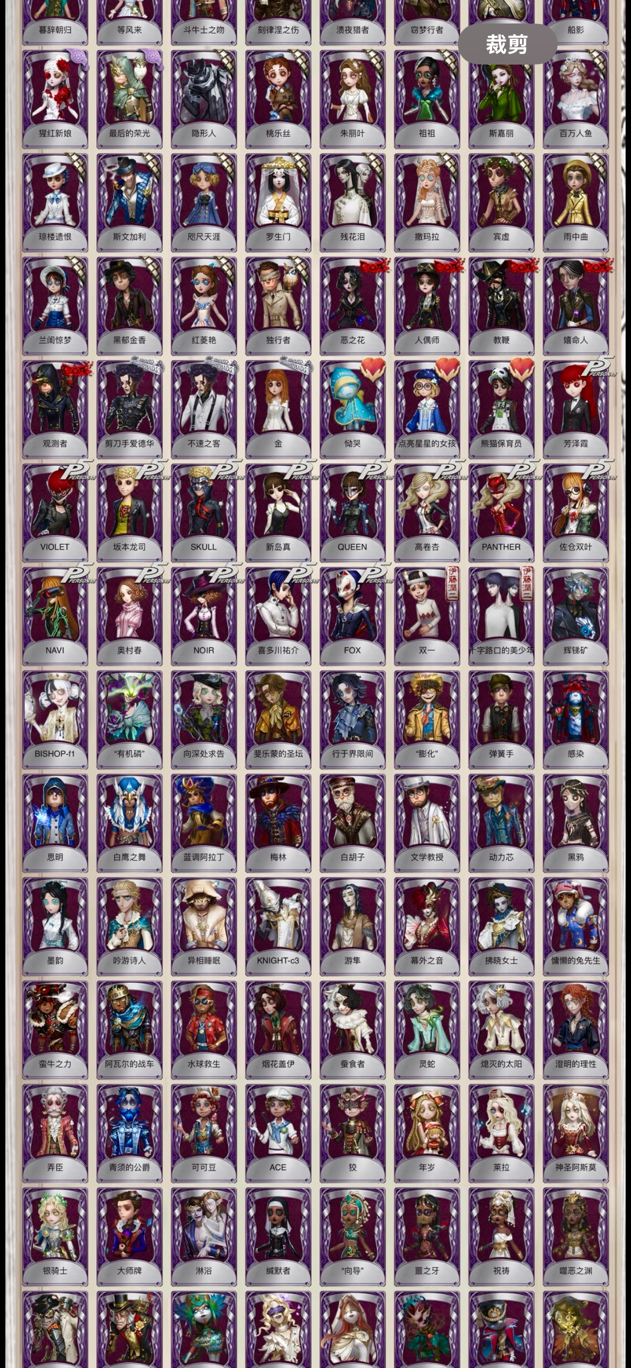 皮肤描述❤希望的残像/摩涅莫绪涅之梦/羊-恶之源/鸽子般的尤迪特/索菲亚/法罗金-猎物的印记/白泽/名誉首席/惊鸿/宇宙女巫/试运者/心锁/菖蒲/裁决之酒/十三娘/赤宴/静默之戟/艾维金-墨菲斯的门廊/白松露/川上富江/蚀日者/哲人石/典狱长/亡灵之主/哭丑金-欺惑之燕/蝰/初拥/珍奇柜/木偶金- KING-h1/温泉煮酒/日落黄沙/大副金-铁钩船长/蜡像金-怒火/邦邦金-三月兔/艾扎克/伊莎贝拉/文豪F4-太宰治-中原中也-芥川龙之介-中岛墩/JOKER/CROW/明智吾郎/日向创/赤松枫/永夜极光/异界行者/真想小姐/先知白/先知黯/祭祀绯/麒麟商人/瑞吉儿/猩红新娘/弹丸联动/柯南联动/p5满配❤