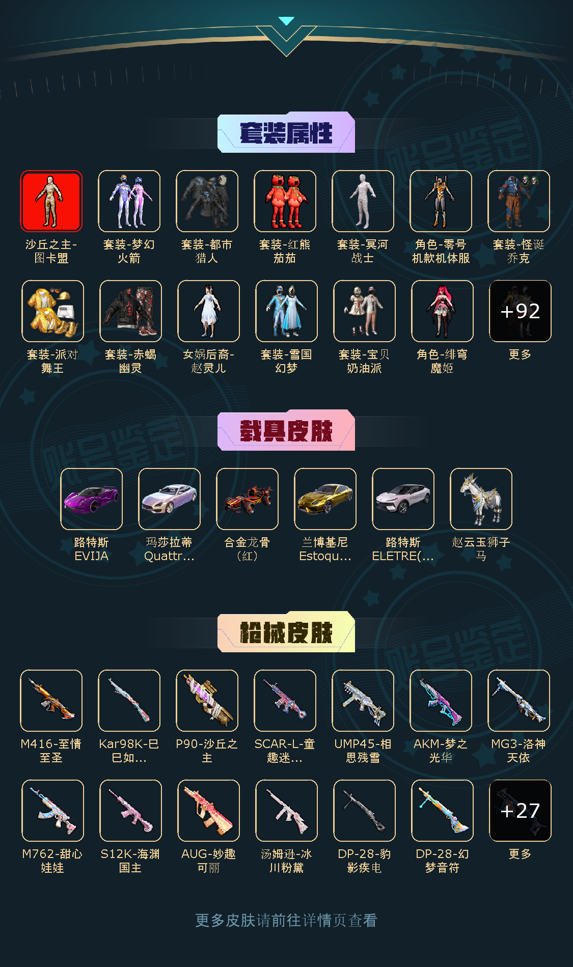 100粉,6载具,40特效枪,386套装,14王牌印记 SCAR-L-梦幻火箭/SCAR-L-童趣迷兔/SKS-碧影闪光/M416-风花雪月/AUG-星之彼岸/M762-甜心娃娃/Vector-红伞翩翩/GROZA-香水柠檬/AWM-橘柚倾心/M416-心之恋语/平底锅-林间仙鹿/M24-暗星紫秘/DP-28-幻梦音符/Mini14-绚金瑰梦/MG3-洛神天依/SCAR-L-青春物语/SLR-暗夜玫瑰/S12K-海渊国主/UMP45-相思残雪/UMP45-恐龙拽拽/M249-蓝莓炮弹/野牛-流星咚咚/AKM-梦之光华/Kar98K-绿意幻情/兰博基尼Estoque(炫光金)/路特斯ELETRE(花绽灰)/合金龙骨(红)