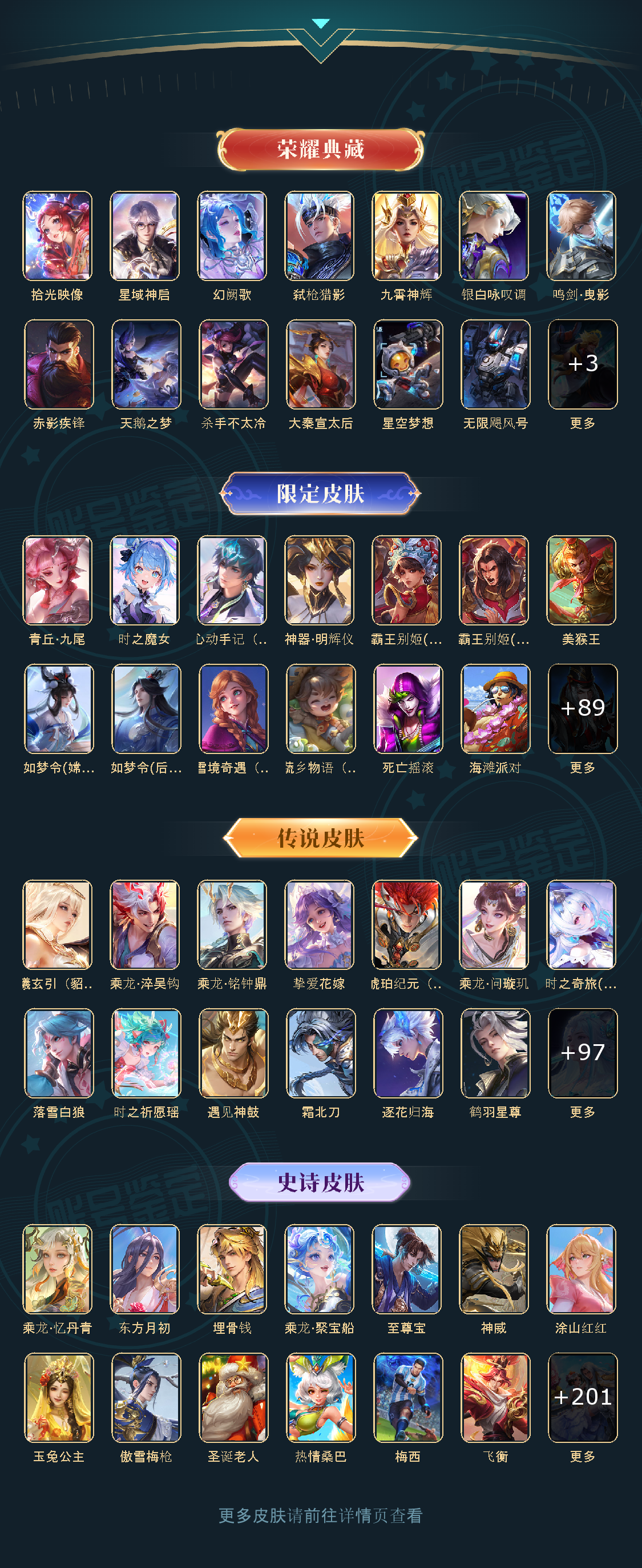 纯白花嫁/天魔缭乱/至尊宝/真爱至上/圣诞老人/热情桑巴/梅西/青龙志/白虎志/朱雀志/久胜战神/飞衡/匿光追影者/冥王哈迪斯/神器·明辉仪/鸣剑·曳影/群星魔术团(上官婉儿)/乘龙·问璇玑/心动手记(朵莉亚)/时之奇旅(大乔)/赤影疾锋/落雪白狼/无双飞将/时之祈愿瑶/遇见神鼓/星域神启/李逍遥/群星魔术团(云中君)/涂山红红/霜北刀/逐花归海/琥珀纪元(马超)/武圣/幻阙歌/琥珀纪元(伽罗)/鹤羽星尊/曦玄引(貂蝉)/霜月吟/乘龙·淬吴钩/东方月初/拾光映像/乘龙·铭钟鼎/妄想实况/埋骨钱/深海之息/黄金天蝎座/夜礼服假面/玉兔公主/补天/乘龙·聚宝船/弑枪猎影/异界灵契/神威/炽阳神光/启示之音/乘龙·忆丹青/心动手记(海诺)/九霄神辉/青丘·九尾/鹤归松栖(云缨)/银白咏叹调/时之魔女/傲雪梅枪/时雨天司/纯白花嫁/天魔缭乱/至尊宝/真爱至上/圣诞老人/热情桑巴/梅西/青龙志/白虎志/朱雀志/久胜战神/飞衡/匿光追影者/冥王哈迪斯/神器·明辉仪/鸣剑·曳影/群星魔术团(上官婉儿)/乘龙·问璇玑/心动手记(朵莉亚)/时之奇旅(大乔)/赤影疾锋/落雪白狼/无双飞将/时之祈愿瑶/遇见神鼓/星域神启/李逍遥/群星魔术团(云中君)/涂山红红/霜北刀/逐花归海/琥珀纪元(马超)/武圣/幻阙歌/琥珀纪元(伽罗)/鹤羽星尊/曦玄引(貂蝉)/霜月吟/乘龙·淬吴钩/东方月初/拾光映像/乘龙·铭钟鼎/妄想实况/埋骨钱/深海之息/黄金天蝎座/夜礼服假面/玉兔公主/补天/乘龙·聚宝船/弑枪猎影/异界灵契/神威/炽阳神光/启示之音/乘龙·忆丹青/心动手记(海诺)/九霄神辉/青丘·九尾/鹤归松栖(云缨)/银白咏叹调/时之魔女/傲雪梅枪/时雨天司