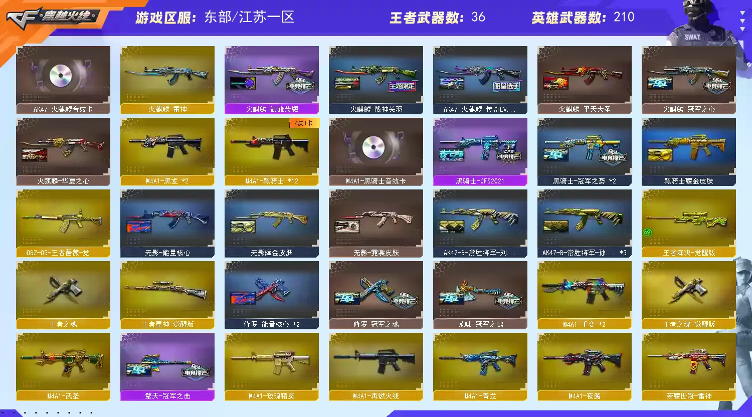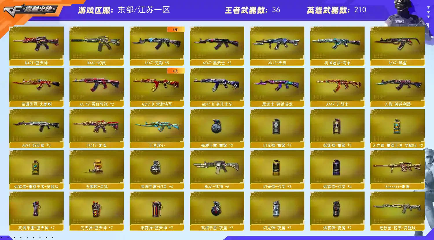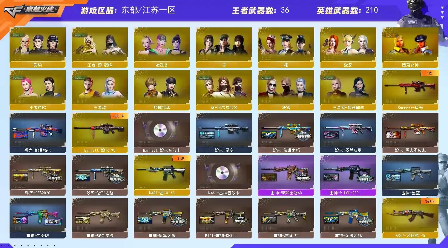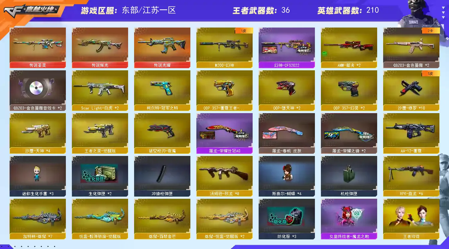 【主武】:248V幻神【CFS2022皮肤】、传说辉光 觉醒版王者星神、传说光耀、传说圣灵、COP357雷霆王者觉醒版、COP-堕天神×2、COP357-幻灵×2、夜魔年套全装、堕天神年套全装、幻灵年套全装、火麒麟(巅峰荣耀)、经典奢华荣耀三件套、冠军之特、火麒麟-冠军之心、雷神-冠军之魄、黑骑士-冠军之势、龙啸-冠军之啸、擎天-冠军之击、炼狱-悦蓝觉醒版、悦蓝-惊涛骇浪觉醒版、王者之魄投掷武器全套、雷神音效卡、火麒麟音效卡、毁灭音效卡、QBZ03-金色蔷薇音效卡(✖2)、黑骑士音效卡烈龙-悦心觉醒版、10烈6盘、斯太尔蝴蝶、王者之心觉醒版、王者之魄觉醒版、王者火魄觉醒版、QBZ03-王者蔷薇觉醒版、王者之势觉醒版、王者之武觉醒版、王者之翼觉醒版、超星新悦享觉醒版、王者雷怒、王者龙血、王者之魂觉醒版×2、王者之灵×2王者之锋觉醒版×3、王者玉锋觉醒版、王者之啸觉醒版、影豹(步枪自动换弹)、凌霄(生化无需换弹)、迷迭香、灵动武士、王者玲珑、王者涂鸦、王者葵-惊若翩鸿、王者零-传说之路、堕落女神、王者-葵-貂蝉、灵狐者职业经理、热门四防爆破生化角色、加特林炼狱x8、烈龙×9、斯太尔蝴蝶、死亡之眼、AA12-雷霆、M200-幻神、王者星神觉醒版、HK417-朱雀、QBZ03-金色蔷薇、毁灭x10、裁决x2、极光、雷神x7、黑骑士x11、火麒麟x6、白虎×2黑武士x2、无影x5、死神×6、千变×2、玫瑰精灵、黑鲨x2、黑龙×2、烈火x2、天启、M4A1-武圣、超新星×2、AK47-B-战士、AK47-常胜将军孙权、AK47-B-战神、猩红传说、金牛座、射手座、9A91-赤血龙魂、EVO III-赤血龙魂、激光毁灭者III、巨龙咆哮Ⅲ、神圣爆裂者-末日III、M4A1-英雄-能量核心、神圣爆裂者III、HK417-赤血龙魂 【皮肤】:M200幻神(2022首款最新皮肤)、火麒麟(巅峰荣耀首款最新皮肤)雷神-冠军之魄、黑骑士-冠军之势龙啸-冠军之啸、火麒麟冠军之心、经典奢华荣耀三件套、AG火麒麟、CFS2018火麒麟、M4A1雷神CFS2019、毁灭-CFS2020、雷神-荣耀之魄、Barrett毁灭荣耀、荣耀之锋、火麒麟枪娘、火麒麟AG、火麒麟关羽、火麒麟Even、火麒麟华夏之心、黑骑士耀金、黑骑士冠军之势、雷神CFS2019、雷神耀金、雷神能量核心、雷神星空、雷神虎将、雷神N9、无影霓裳无影耀金、无影能量核心、冠军之心、天天龙白鲨、毁灭星空、火麒麟-CFSTAR、修罗-CFSTAR、天龙-CFSTAR、极光-能量核心、黑龙-能量核心、战神-粉色甜心皮肤、战神-紫绶金章皮肤、荣耀世冠-雷神、荣耀世冠-火麒麟、屠龙-荣耀世冠AG 【王者】:王者之心觉醒版、王者之魄觉醒版、王者火魄觉醒版、QBZ03-王者蔷薇觉醒版、炼狱悦蓝觉醒版、悦蓝-惊涛骇浪觉醒版、烈龙-悦心觉醒版、王者之势觉醒版、王者之武觉醒版、王者之翼觉醒版、超星新悦享觉醒版、王者雷怒、王者龙血、王者之魂觉醒版×2、王者之灵×2、王者之锋觉醒版×3、王者玉锋觉醒版、王者之幻、王者之啸醒版、王者之武、超新星-悦享、炫金火麒麟、炫金雷神、炫金无影、炫金武士、烈龙-悦心、 【掌上武器】:火麒麟-灵狐、雷神小红、迷你深渊冰龙(迷你近身)、斯泰尔蝴蝶(生化迷你)x2、金色小号、巴雷特-零-水下丽影、M37-葵、COP-旗袍、 【副武】:COP357雷霆王者觉醒版、COP-堕天神×2、COP357-幻灵×2、破空枪刃-夜魔、COP旗袍、王者之魂、王者之灵、修罗x12、沙鹰-天神x6、COP-小白龙、新USP-怒火大圣、新USP-战龙、阐释者、MAC-10-涂鸦 【角色】:影豹(步枪自动换弹)、凌霄(生化无需换弹)、迷迭香、灵动武士、王者玲珑、王者涂鸦、王者葵-惊若翩鸿、王者零-传说之路、堕落女神、王者-葵-貂蝉、灵狐者-职业经理、零-水下丽影、零-热舞青春、兰-海滩派对、零、瞳、樱、迷迭香、魅影、灵狐者、王力宏、海军陆战队、潘多拉-X、新娜塔莎、救世主-X、蜀雪、铁骑荣耀、潜龙队-X、、零-热舞青春、灵狐者-职业经理、救世主、邓紫棋、雷霆-α、雷霆-β、复仇者、海豹突击队、救世复仇、刀锋、飞虎队、堕天使、潘多拉、威锋、陈龙野、猎狐者、陈龙野-X、幻影、猎狐者-X、斯沃特精英、赛斯、新斯沃特、铁骑、新奥摩、新赛斯、奥摩、斯沃特