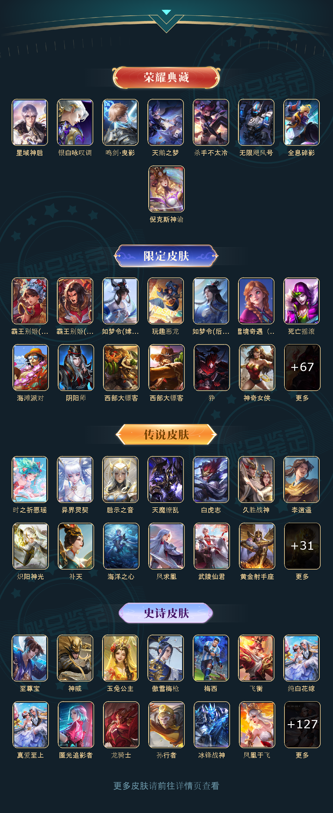 冰锋战神/街头霸王/天鹅之梦/纯白花嫁/天魔缭乱/至尊宝/杀手不太冷/真爱至上/凤求凰/逐梦之影/武陵仙君/神奇女侠/梅西/无限飓风号/黄金狮子座/一生所爱/全息碎影/冰霜恋舞曲/青龙志/白虎志/朱雀志/太华/久胜战神/飞衡/梁祝/倪克斯神谕/白鹤梁神女/匿光追影者/鸣剑·曳影/遇见胡旋/星域神启/李逍遥/武圣/奔雷神使/孙行者/玉兔公主/补天/异界灵契/神威/启示之音/傲雪梅枪/淬星耀世/时雨天司