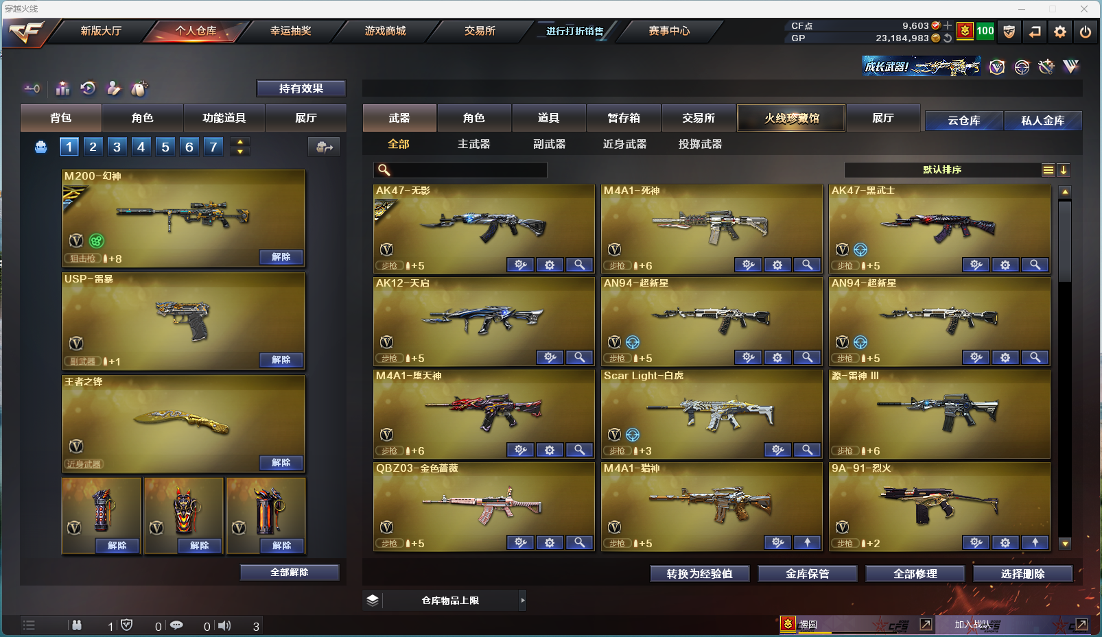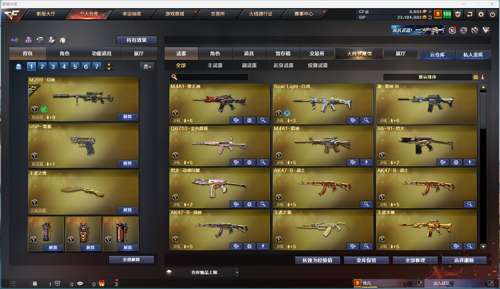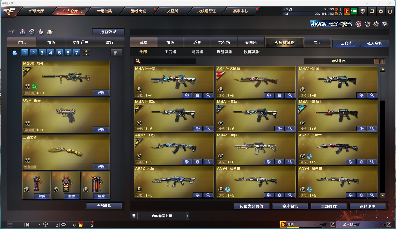 V武器 AK47-火麒麟,AK47-无影,AK47-黑武士,M4A1-雷神,M4A1-黑骑士,M4A1-死神,M4A1-黑龙,M4A1-堕天神,M4A1-千变,M4A1-猎神,Barrett-毁灭,Barrett-极光,Barrett-朱雀,AWM-裁决,M200-幻神,AA-12-雷霆,AN94-超新星,AK12-天启,QBZ03-金色蔷薇,Scar Light-白虎,9A91-烈火,RPK-盘龙,加特林-炼狱,沙鹰-修罗,沙鹰-天神,擎天,黑骑士-海王,USP-雷暴,AK47-B-常胜将军,Barrett-暗月传说,AK47-B-战士,AK47-B-战神,裁决,盘龙,天神,修罗,龙啸-烈火龙威,烈火-动感闪耀,天神-动感闪耀,屠龙-动感闪耀,龙啸-堕天神,麒麟刺-堕天神,COP-堕天神,炼狱-风暴,AK47-B-身先士卒,雷霆之锋王者武器 王者凤吟,王者火魄-觉醒版,王者风势-觉醒版,王者之鲨-觉醒版,王者之烈-觉醒版,王者之锋-觉醒版 炫金武器 炫金雷神,炫金无影 AK47稀有皮肤 火麒麟-平天大圣 M4A1稀有皮肤 雷神-星空