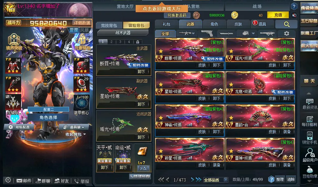 传说✨瑶光终焉丨星珀终焉丨神谕终焉丨墨韵合丨神谕终焉丨龙息终焉丨无限EX丨碎星终焉丨雷神终焉丨无尽光影终焉 x3丨SCAR-影魔 x2丨RPK主宰丨AK47主宰丨屠魔丨