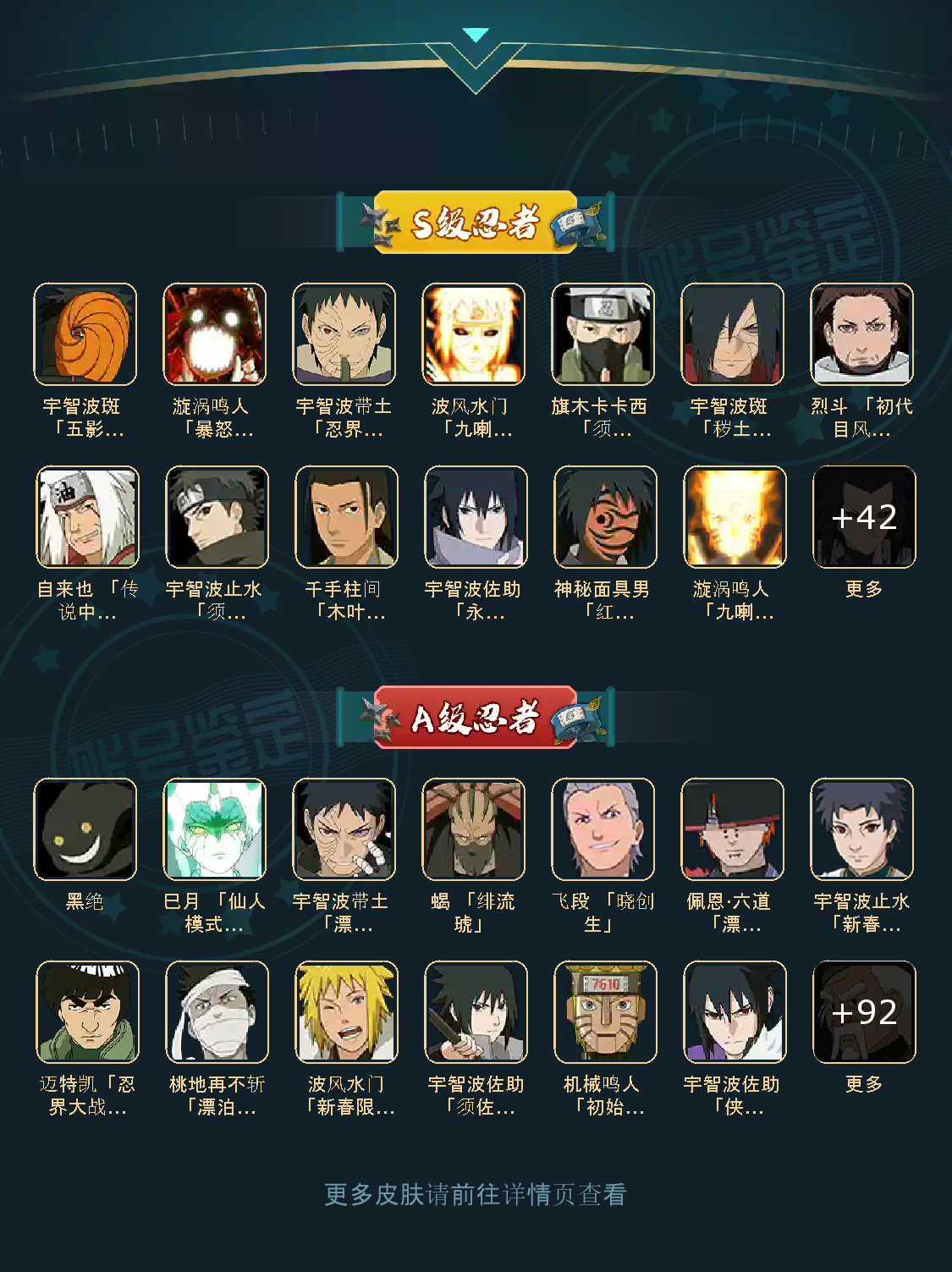S级忍者(52个):,波风水门「九喇嘛连结」,自来也,舍人,旗木卡卡西「须佐能乎」,宇智波止水「须佐能乎」,艾「忍界大战」.大筒木桃式,宇智波斑「秽土转生•解」,千手柱间「木叶创立」,宇智波佐助「永恒万花筒」,神秘面具男「红夜之刃」,春野樱「忍界大战」,大简木金式「博人传」,流涡鸣人「九喇嘛连结」,三代目风影「秽士转生」,大野木「忍界大战」,迈特凯「死门」,宇智波斑「木叶创立」,宇智波带士「忍界大战」,千手柱间「秽士转生」,罗砂「四代目风影」,宇智波鼬「秽士转生」,自来也「舞之豪杰」,佩恩•天道「超」,药师兜「仙人模式」,宇智波斑「秽士转生」,艾「三代目雷影」,宇智波斑「白面具」,半藏「秽士转生」,千手扉间「秽士转生」,纲手「百豪」,无「二代目士影」,波风水门『秽士转生」,金角•银角「秽士转生」,猿飞日斩「秽土转生」,长门「秽士转生」,宇智波斑,千手柱间,艾「四代目雷影」,千手扉间,神秘面具男,鬼灯幻月「二代目水影」,佩恩「天道」,大蛇丸,波风水门,纲手,自来也,宇智波鼬「须佐能乎」,大野木「三代目士影」,自来也「仙人模式」,猿飞日斩