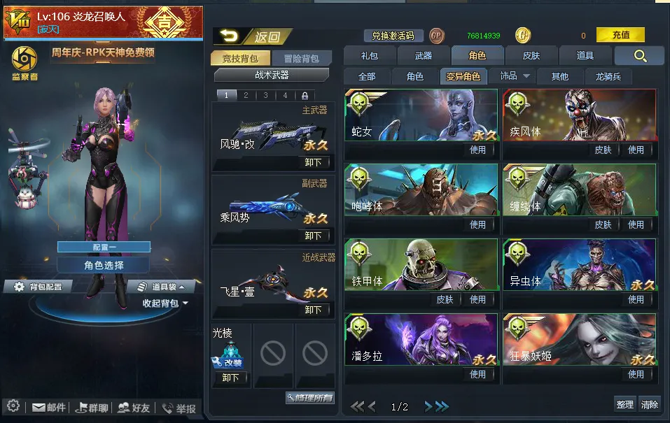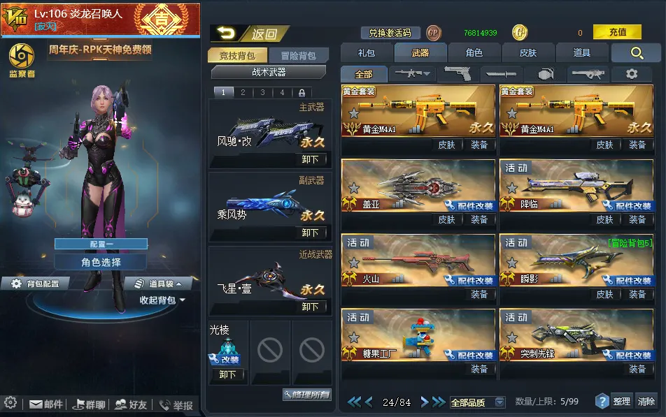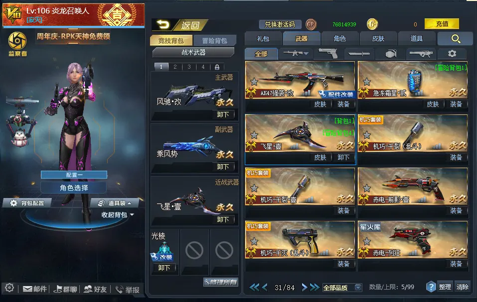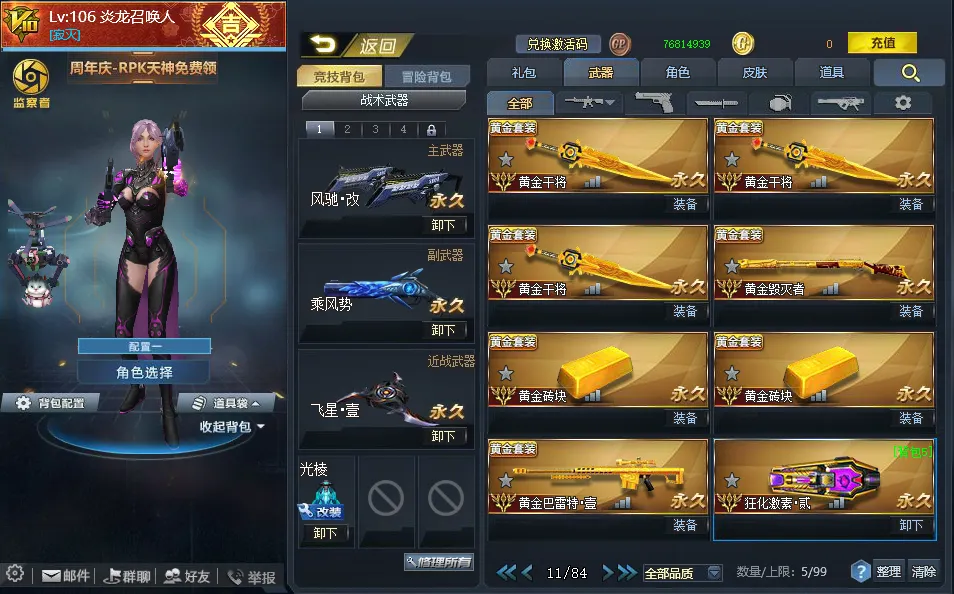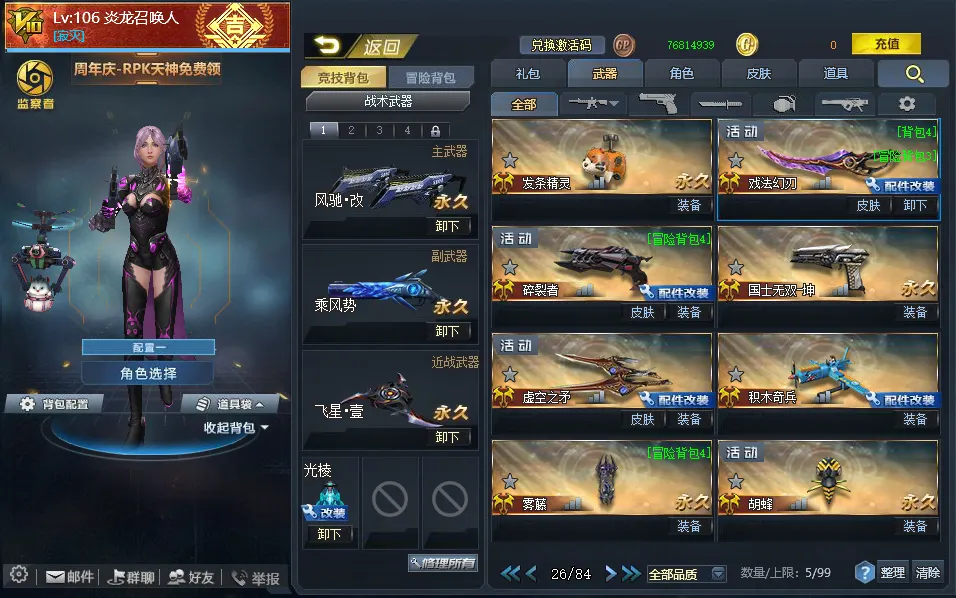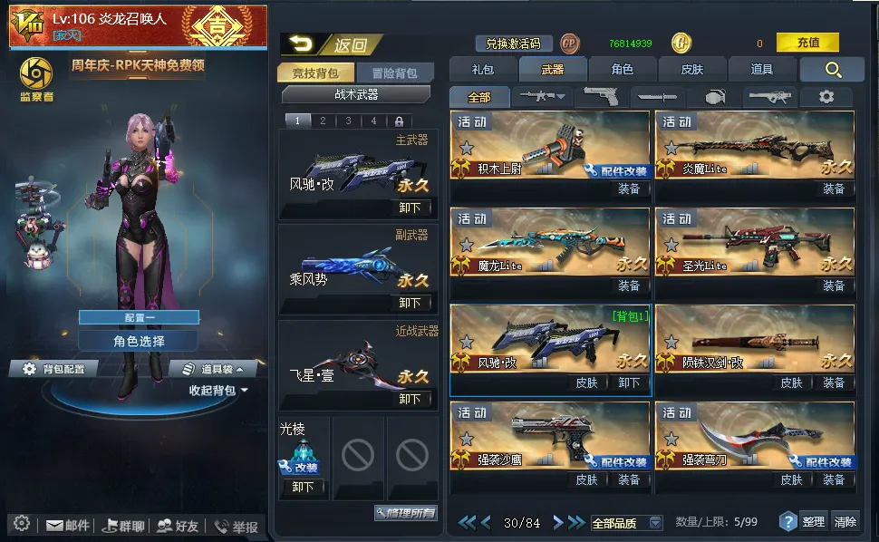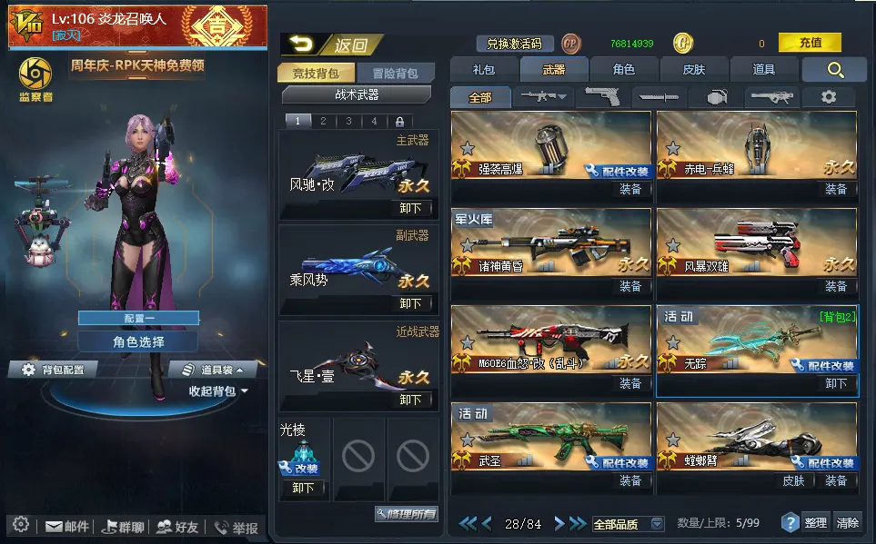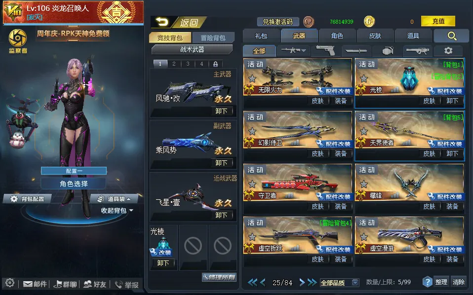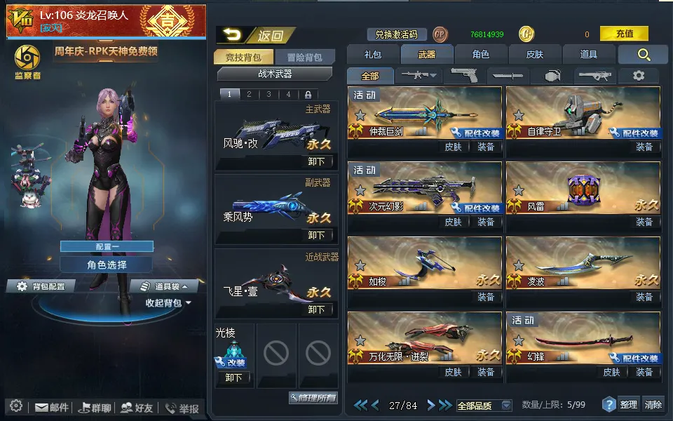 【配件武器】[满配降临][满配虚空漫游][满配螳螂臂][满配原石之力][满配狂暴之握][三配虚空链接][三配藏锋][二配仲裁巨剑][二配天界使者][二配戏法]
