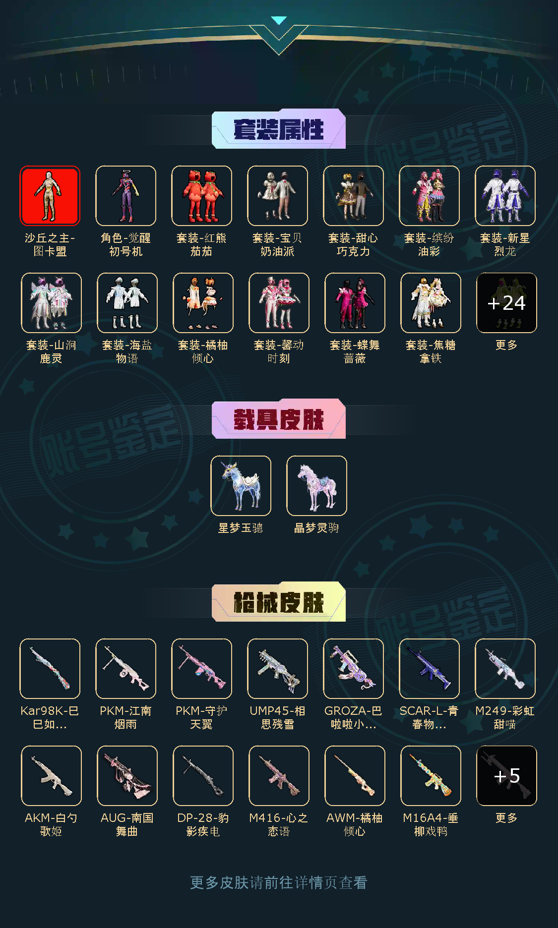 【粉色枪皮】M416-心之恋语/AKM-白勺歌姬/M16A4-垂柳戏鸭/SCAR-L-青春物语/M416-墨龙九天/GROZA-巴啦啦小魔仙/GROZA-旋转彩虹/AUG-南国舞曲/Kar98K-巳巳如意/AWM-橘柚倾心/M417-第五大道/UMP45-相思残雪/AKS-74U-信仰神谕/M249-彩虹甜喵/DP-28-千金淑猫/PKM-江南烟雨/PKM-守护天翼