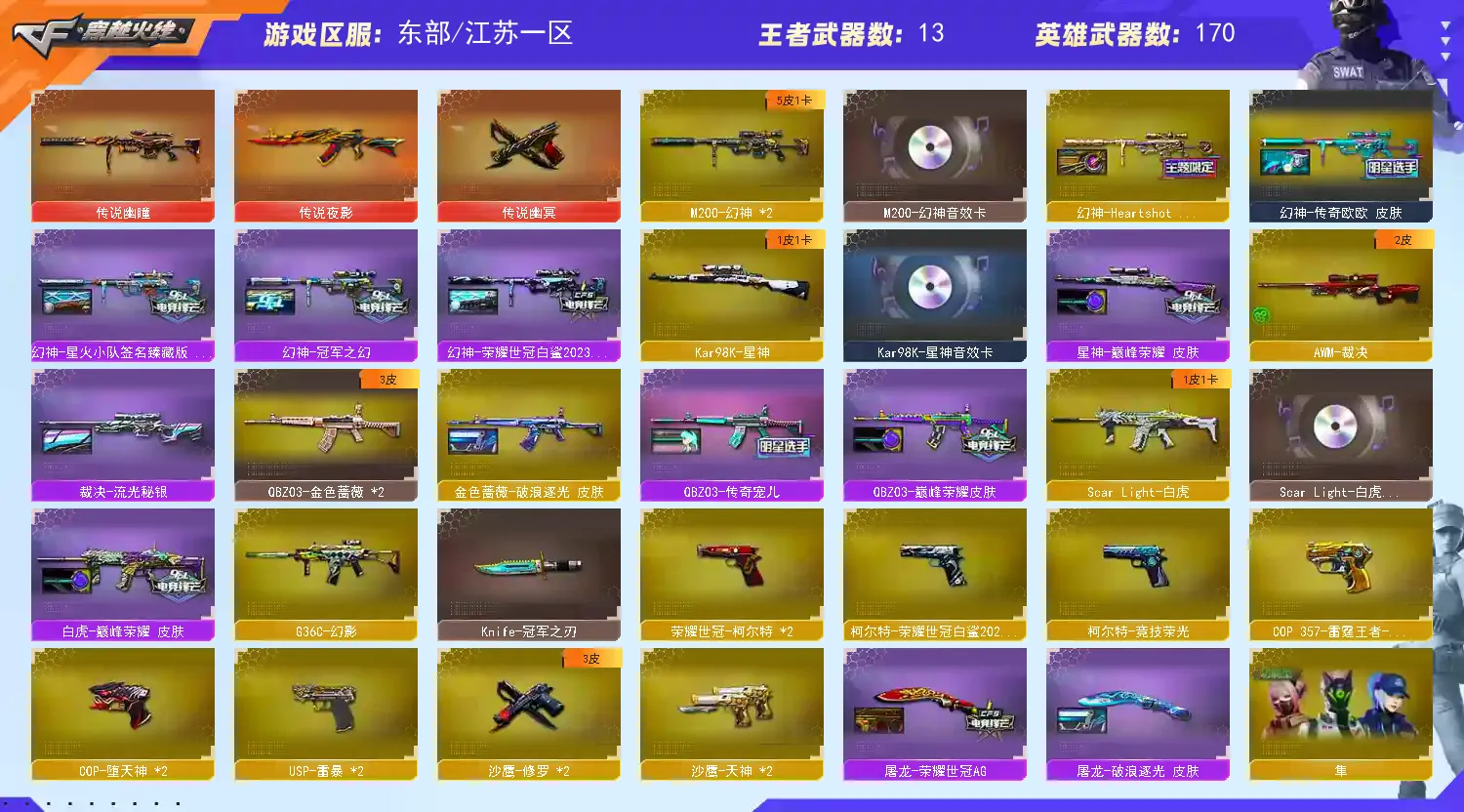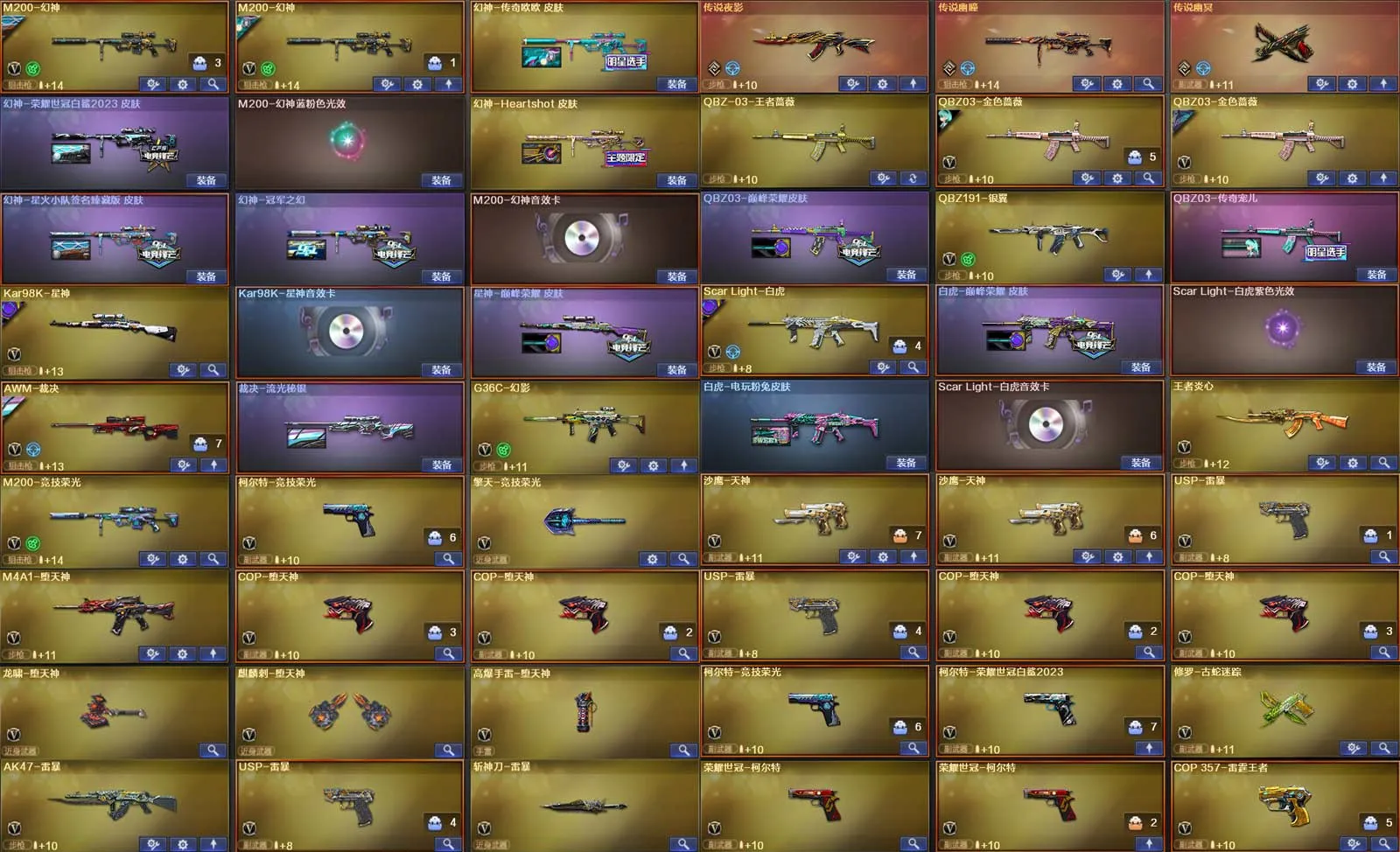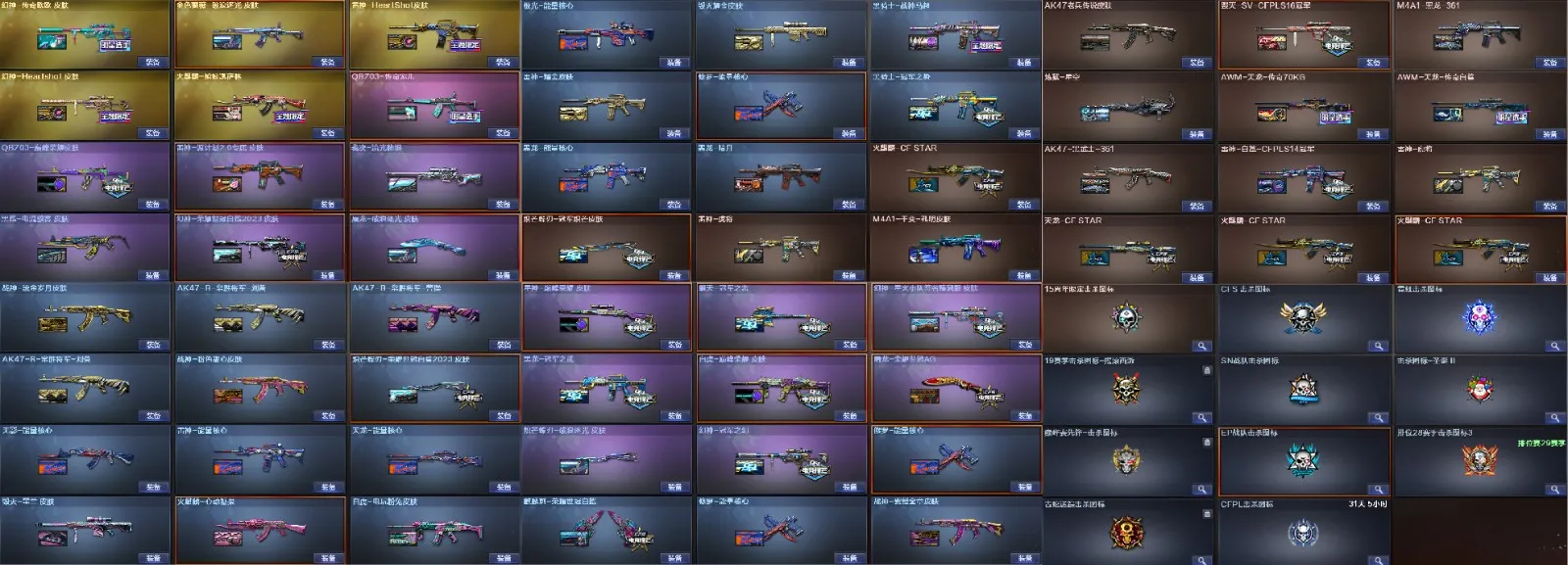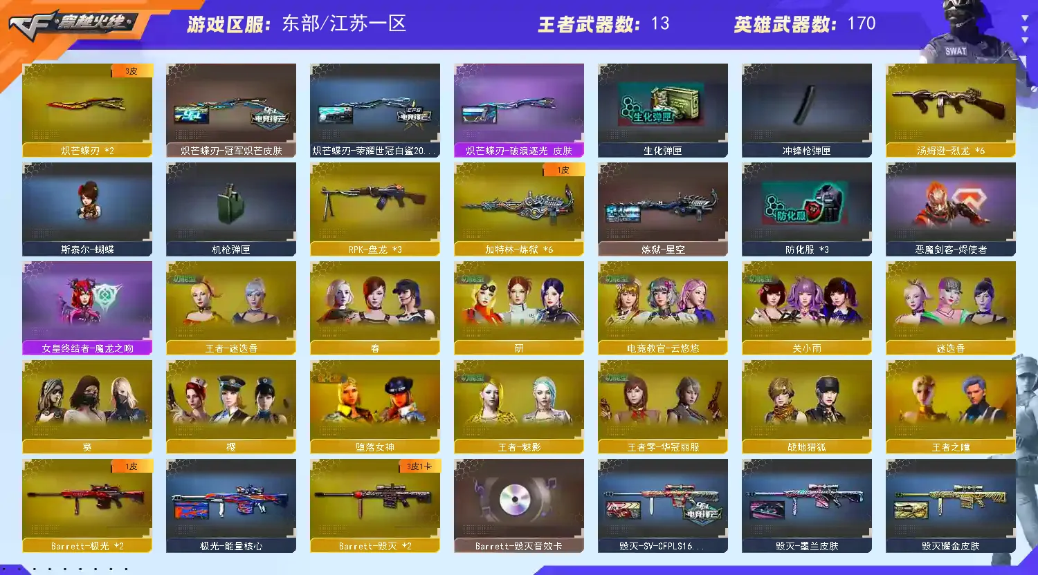 多四防角色,各种皮肤武器光效玩偶道具,欢迎来体验!武器太多,截不了那么多图!【此号全部装备太多截不了太多图,还有很多神器未截图,普通CF点武器也是一百多个就不截图了(满背包满道具爆破、生化、挑战武器应有尽有多个玩偶主流武器多光效),主流枪械都有皮肤】