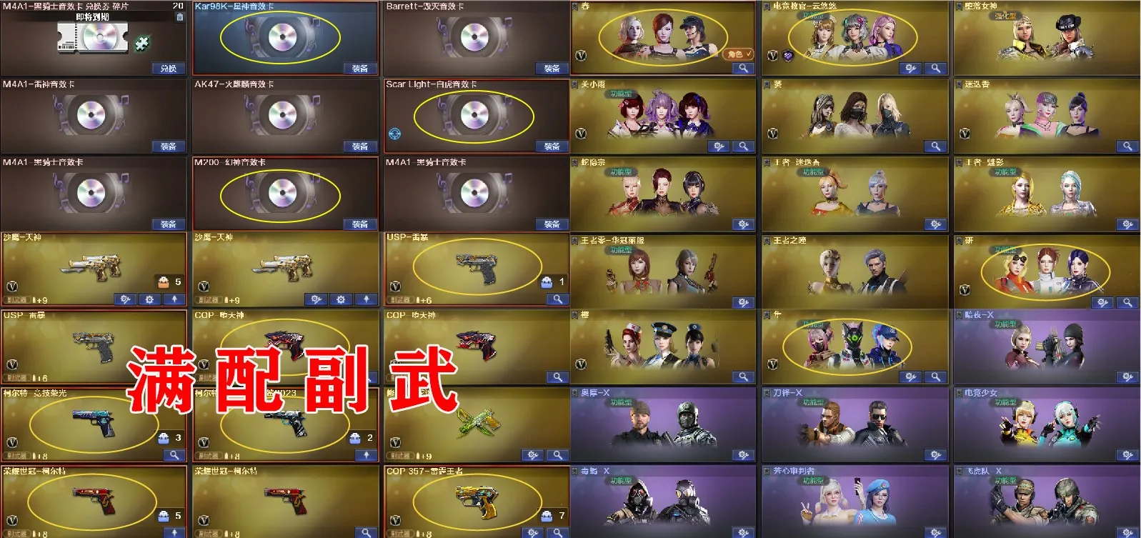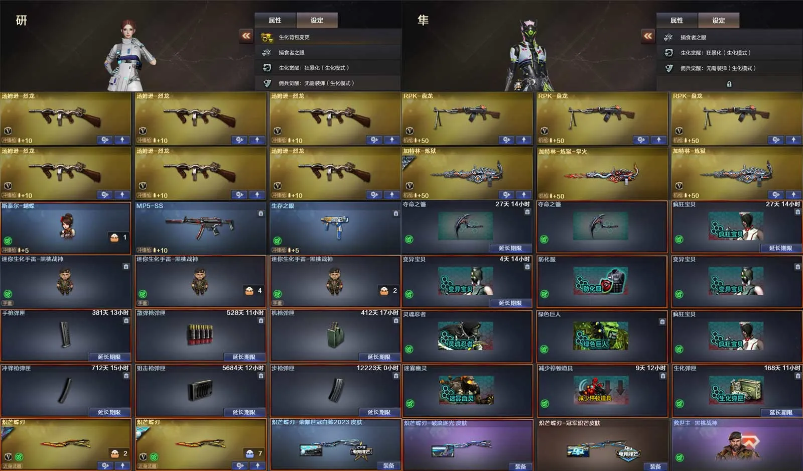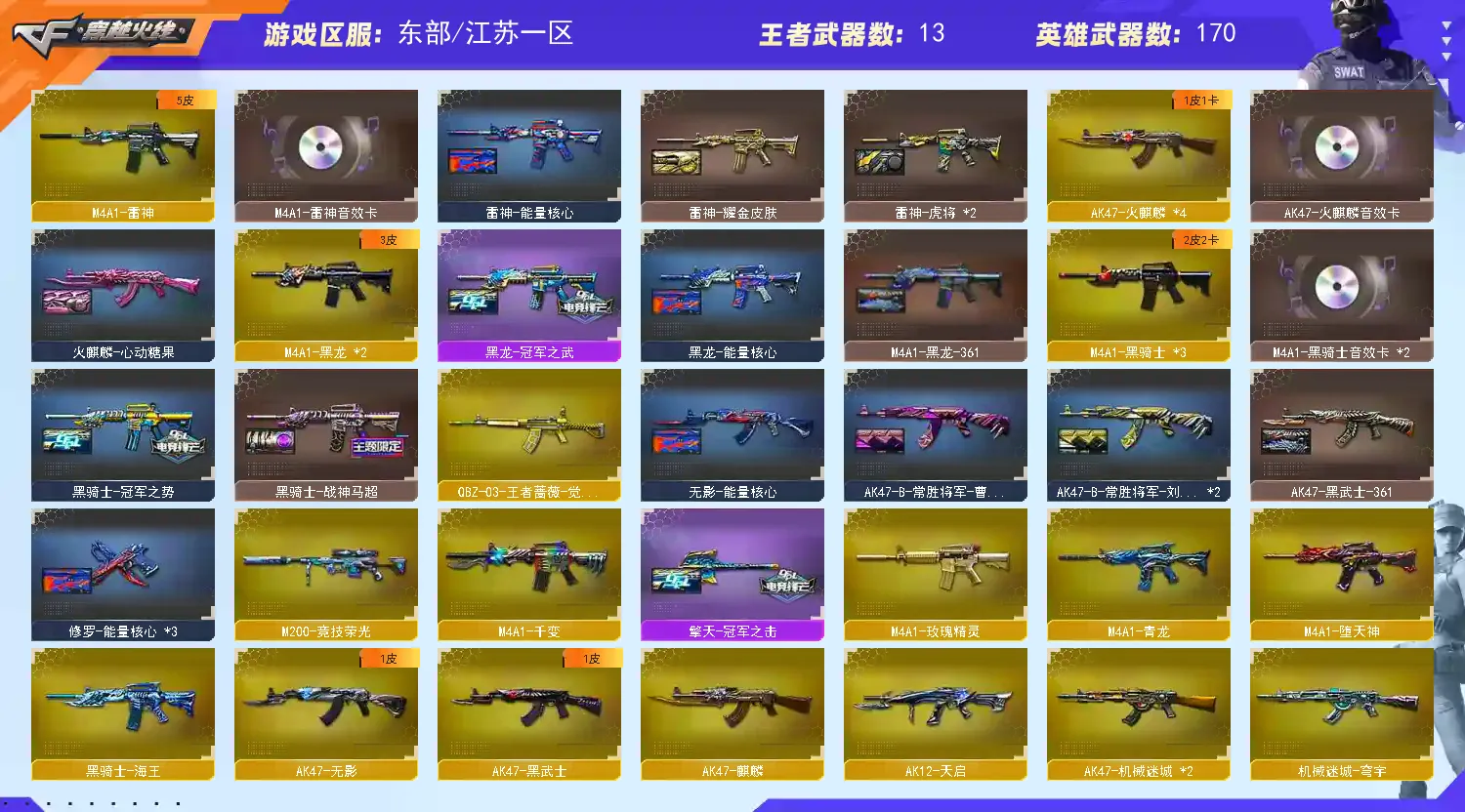多四防角色,各种皮肤武器光效玩偶道具,欢迎来体验!武器太多,截不了那么多图!【此号全部装备太多截不了太多图,还有很多神器未截图,普通CF点武器也是一百多个就不截图了(满背包满道具爆破、生化、挑战武器应有尽有多个玩偶主流武器多光效),主流枪械都有皮肤】