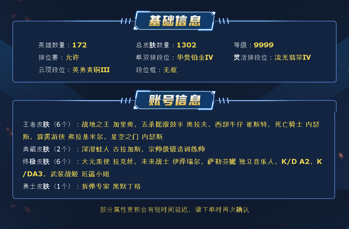 ~~喜欢记得收藏~~可排位~~1239皮全英雄丨90神话/至臻/海克斯丨IG套丨神龙尊者套丨灵魂莲华套丨星之守护者套丨KDA套丨创星璐璐丨御星艾希丨卧虎藏龙丨哨兵薇恩丨女帝卡特丨勇敢的心丨嫦娥皎月丨鼠年武器丨FPX李青丨羊年金克斯丨电玩女枪卡莎丨玉剑男刀女刀剑姬剑圣~~租之前尽量查一下游戏ID,确保段位是您需要的,避免浪费您的时间~~请勿挂机逃跑故意送人头,谢谢合作,谢谢~~