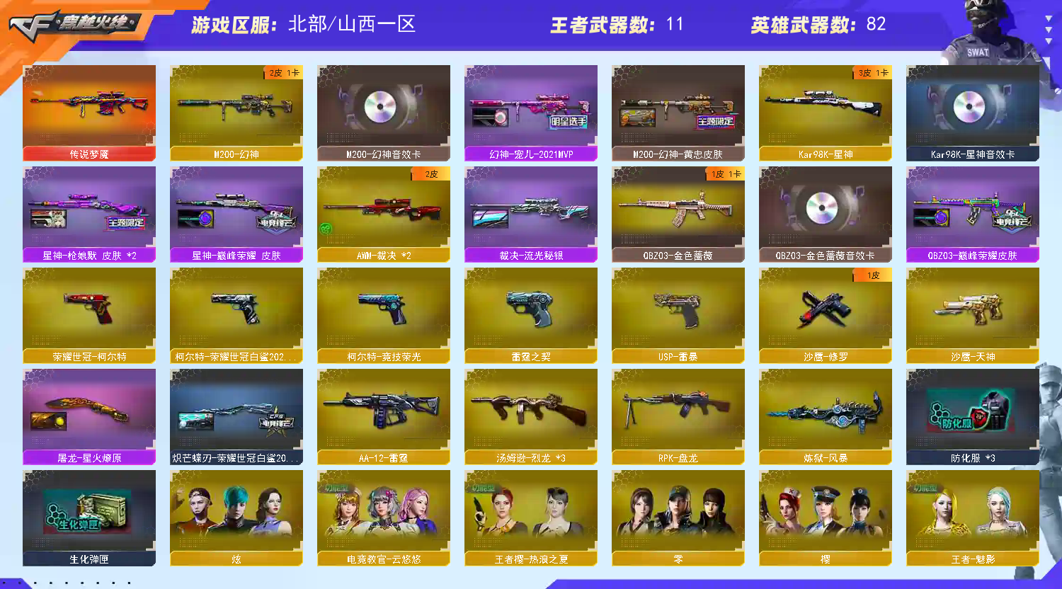 禁排【m200幻神+音效卡+宠儿皮肤+黄忠】【98k星神+音效卡+呛娘皮肤+巅峰荣耀】【m200竞技荣光】【王者星霆】【6烈龙 盘龙 炼狱 炽芒蝶刃 死亡之眼 】【传说梦魇】【hk417朱雀】【qbz金色蔷薇+卡+巅峰荣耀】【火麒麟】【黑龙+冠军之武】【雷神+宠儿皮肤+n9皮肤+白鲨冠军】【黑骑士+卡】【毁灭+卡+cfs2018】【裁决】 【武器:王者之魄 王者之戮 王者之武 王者火魄 王者之烈 天龙 】 【7手呛:修罗 沙鹰天神 cop雷霆 usp雷暴 柯尔特竞技荣光 柯尔特荣耀世冠白鲨 荣耀世冠柯尔特】 【9刀具:屠龙*3 龙啸 尼泊尔雷霆 麒麟刺堕天神 擎天竞技荣光 龙啸热带奇洋】 【7雷套:雷霆雷*5 堕天神雷*2】 【小人呛:cop白鲨】 【音效卡: 星神音效卡 幻神音效卡 金色蔷薇音效卡 毁灭音效卡 黑骑士音效卡】 【四防角色:云悠悠 呛娘樱 王者魅影 职业经理】