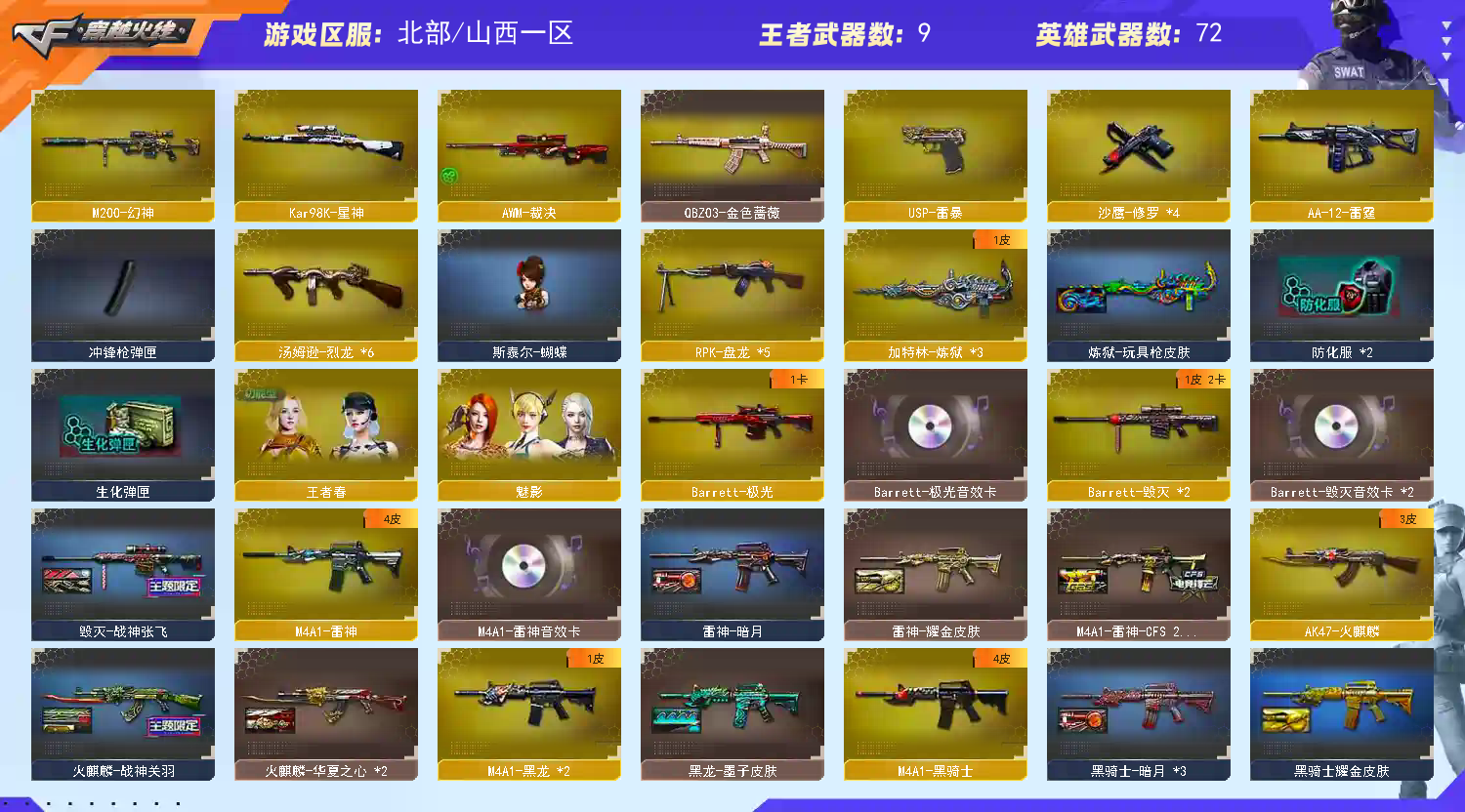 王者春/魅影(普通)【王者武器8】王者之心-觉醒版/王者之魄-觉醒版/王者之光/王者之力/王者之锋*3/王者之啸-觉醒版【炫金武器10】炫金雷神*2/炫金骑士*2/炫金毁灭*2/炫金天龙/炫金天神/炫金修罗*2【热门武器23】M200-幻神/Kar98K-星神/斯泰尔-蝴蝶/USP-雷暴/6烈龙/5盘龙/4修罗/3炼狱/黑骑士-摸金校尉【英雄武器71】M4A1-玫瑰精灵/M4A1-黑骑士/9A91-烈火*3/AK12-天启*4/AK47-火麒麟/AK47-黑武士/M4A1-武圣/AK47-黑鲨*4/M4A1-黑龙*2/M4A1-雷神/QBZ03-金色蔷薇/M4A1-龙血*2/Kar98K-星神/AWM-天龙/Barrett-毁灭*2/M200-幻神/Barrett-极光/AWM-裁决/汤姆逊-烈龙*6/RPK-盘龙*5/加特林-炼狱*3/屠龙*2/麒麟刺*2/斩神刀-雷暴/龙啸*2/擎天*3/AA-12-雷霆/高爆手雷-雷暴*4/闪光弹-雷暴*4/烟雾弹-雷暴*4/沙鹰-修罗*4/USP-雷暴【热门皮肤武器13】M4A1-雷神-CFS 2019/AWM-天龙-传奇白鲨/修