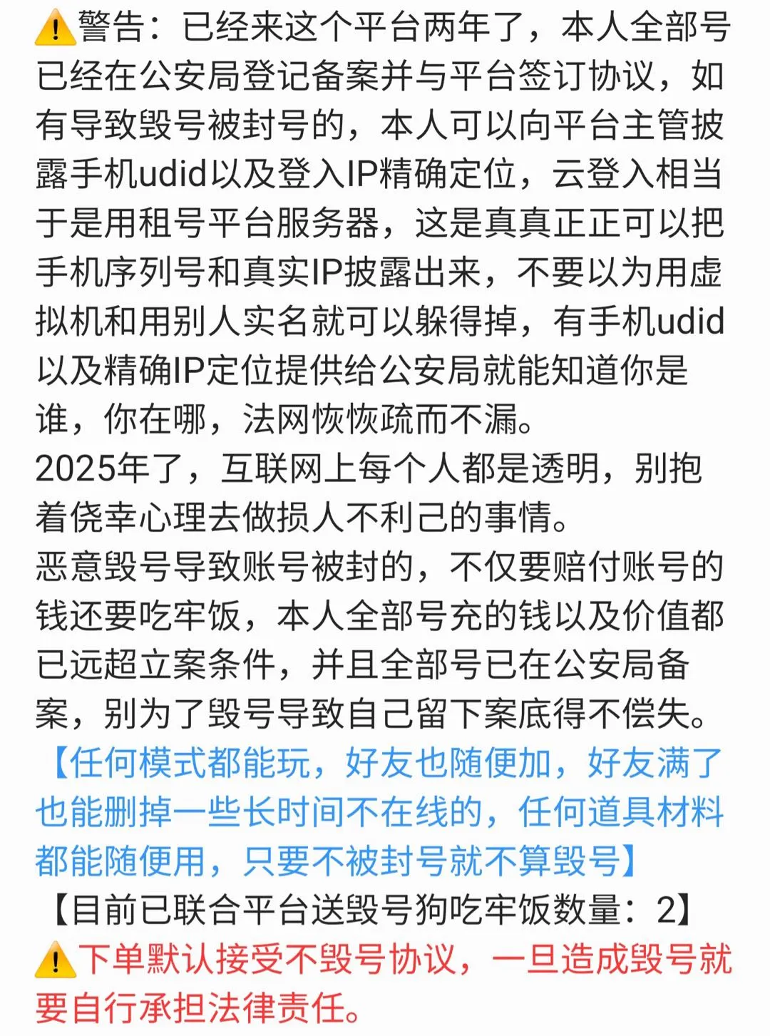 A:禁.止利用账号进行开挂、使用辅助违规软件诈骗等违规操作B:毁号行为涉及毁坏虚拟财产罪及计算机安全罪,请文明游戏素质游戏,让我们共建美好租号平 台! C:请游戏 局内保持文明,防止禁言影响他人游 戏,祝您玩得愉快! D:喜欢本账号请点 ★收藏仑方便下次租用,谢谢光临惠顾!