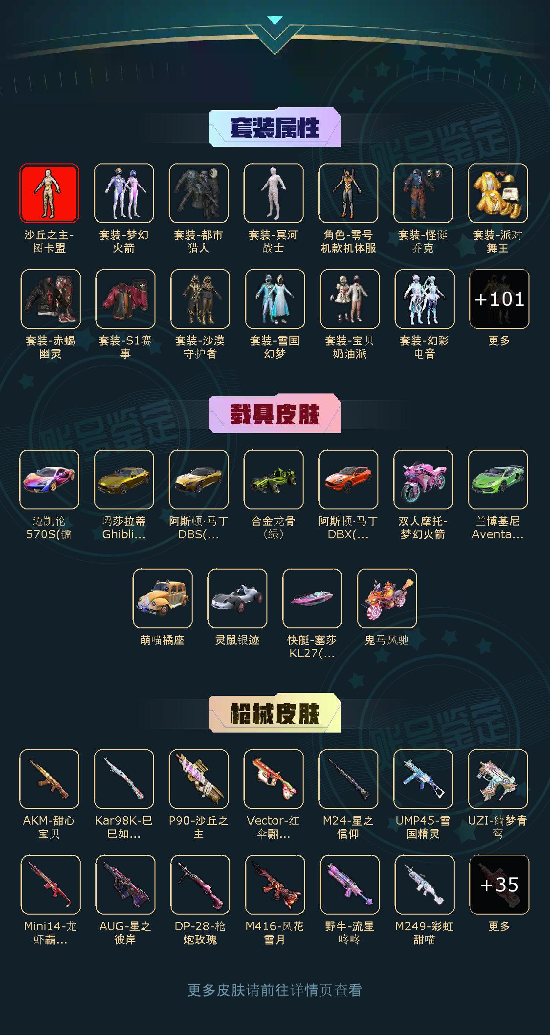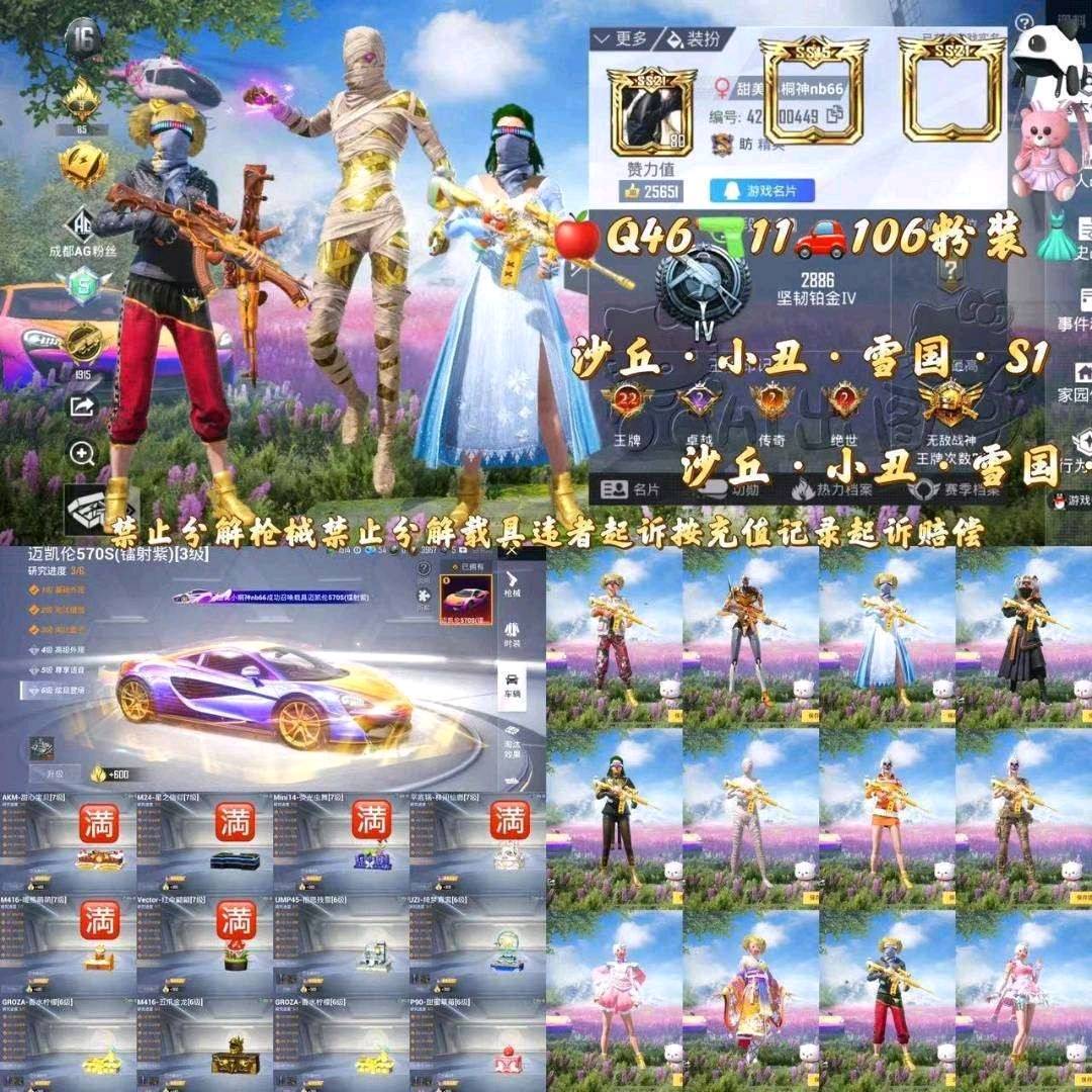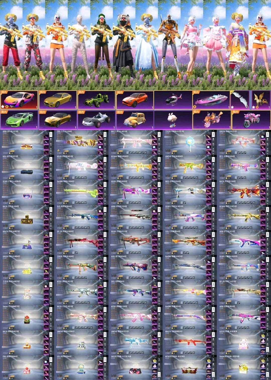 107粉,11载具,531套装,27王牌印记 M417-第五大道/UZI-绮梦青鸾/AKM-甜心宝贝/DP-28-扶摇飞仙/SCAR-L-梦幻火箭/SCAR-L-童趣迷兔/Kar98K-伏魔团/M416-风花雪月/AUG-星之彼岸/M249-彩虹甜喵/平底锅-仲夏莫吉托/AWM-花间之火/GROZA-旋转彩虹/汤姆逊-怪笑疯兔/AWM-焰龙焚天/Vector-红伞翩翩/P90-甜蜜草莓/SKS-诡面斩/Kar98K-巳巳如意/M762-激战未来/GROZA-香水柠檬/M416-暖熊萌萌/M416-心之恋语/平底锅-林间仙鹿/M16A4-葫芦兄弟/Mini14-荧光虫舞/M416-五爪金龙/DP-28-枪炮玫瑰/M16A4-垂柳戏鸭/AKM-炫紫旋律/MG3-洛神天依/M249-古战神甲/SLR-暗夜玫瑰/VSS-烈焰拳霸/Kar98K-暗翼战神/UMP45-雪国精灵/M762-甜蜜誓约/UMP45-相思残雪/SCAR-L-机甲封神/M24-星之信仰/UMP45-恐龙拽拽/Mini14-龙虾霸霸/M249-蓝莓炮弹/野牛-流星咚咚/P90-沙丘之主/AKM-梦之光华/Kar98K-绿意幻情/兰博基尼Aventador(翡翠绿)/玛莎拉蒂Ghibli(金)/萌喵橘座/阿斯顿·马丁DBX(橙)/双人摩托-梦幻火箭/快艇-塞莎KL27(霓虹粉)/灵鼠银迹/迈凯伦570S(镭射紫)/合金龙骨(绿)/阿斯顿·马丁DBS(金)/鬼马风驰/