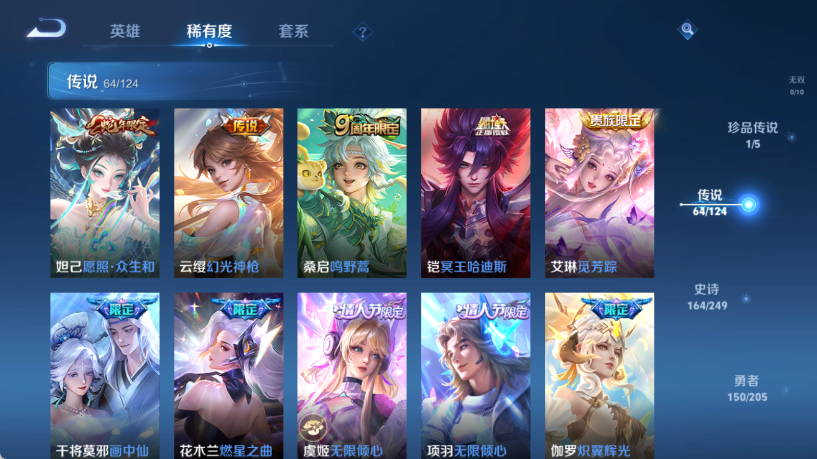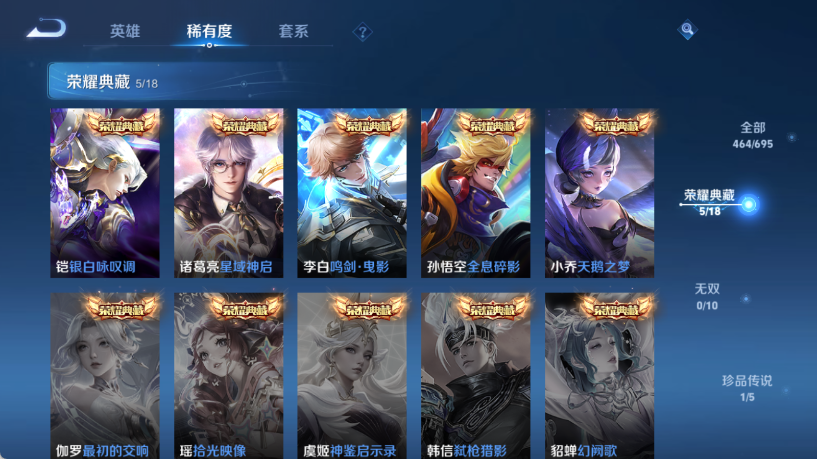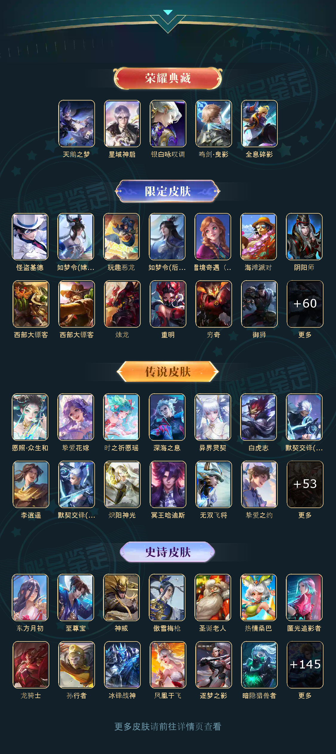 贵族等级V10,英雄数量122,典藏皮肤数5,皮肤数量464,冰锋战神/街头霸王/天鹅之梦/至尊宝/圣诞老人/凤求凰/热情桑巴/逐梦之影/武陵仙君/黄金狮子座/全息碎影/大圣娶亲/冰霜恋舞曲/青龙志/白虎志/朱雀志/太华/久胜战神/飞衡/梁祝/白鹤梁神女/匿光追影者/鸣剑·曳影/星域神启/李逍遥/奔雷神使/孙行者/玉兔公主/异界灵契/神威/傲雪梅枪/淬星耀世/时雨天司