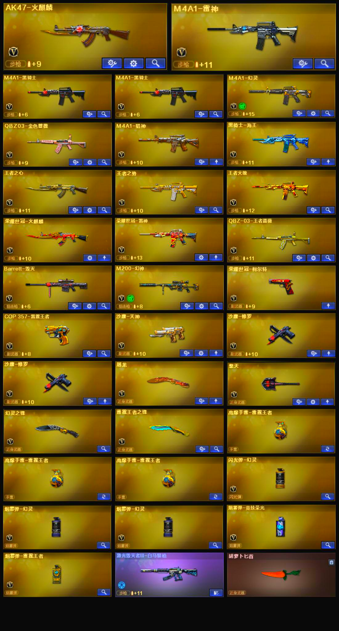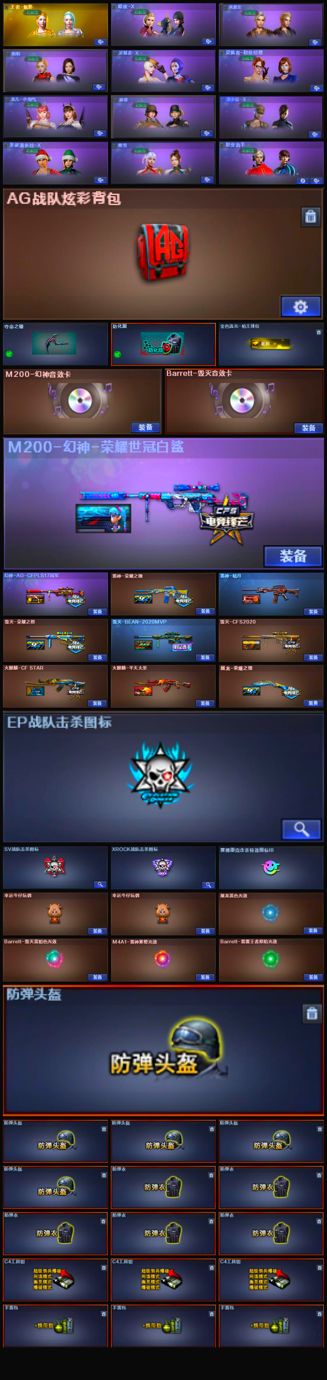 【m200幻神+音效卡+幻神-ag17冠军+荣耀世冠白鲨】 【qbz金色蔷薇】 【荣耀世冠套】 【火麒麟】 【雷神+雷神-荣耀之魄】 【黑骑士+白马银呛】 【毁灭+音效卡+毁灭-荣耀之怒】 【王者之心 王者之势 王者火魄 qbz王者蔷薇】 【猎神 海王】 【5手呛 修罗*2 天神 cop雷霆王者】 【4近战 屠龙 擎天 幻灵之锋】 【四防角色 王者魅影 职业经理】 【幻神音效卡 黑骑士音效卡】 【ag炫彩背包】