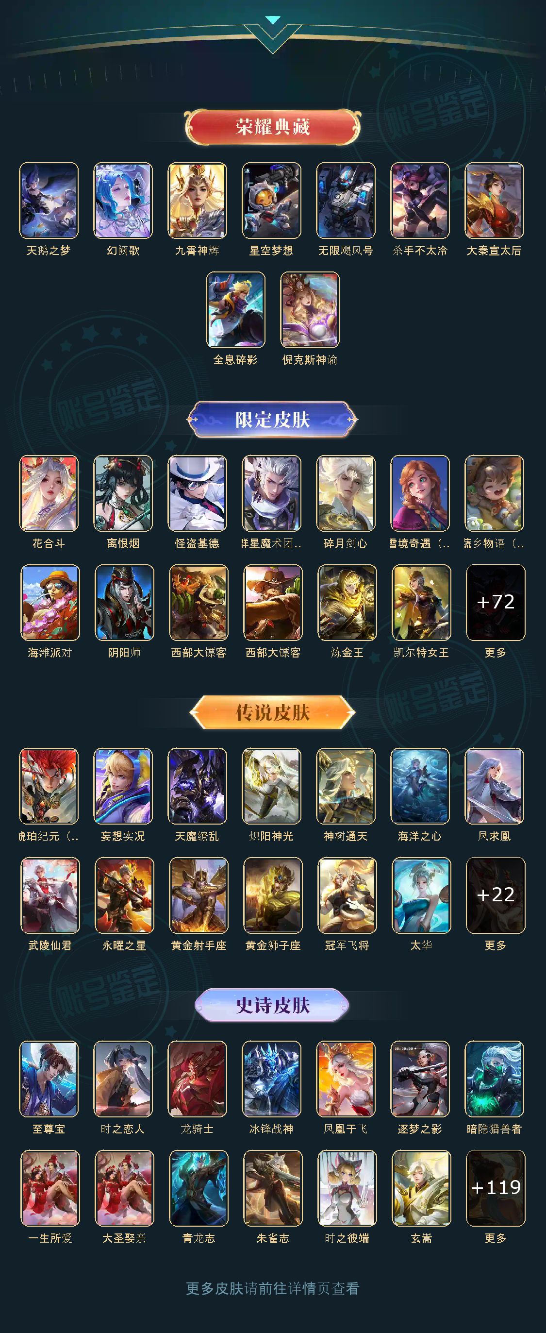 贵族等级V10,英雄数量125,典藏皮肤数8,皮肤数量422,天鹅之梦/星空梦想/无限飓风号/全息碎影/倪克斯神谕