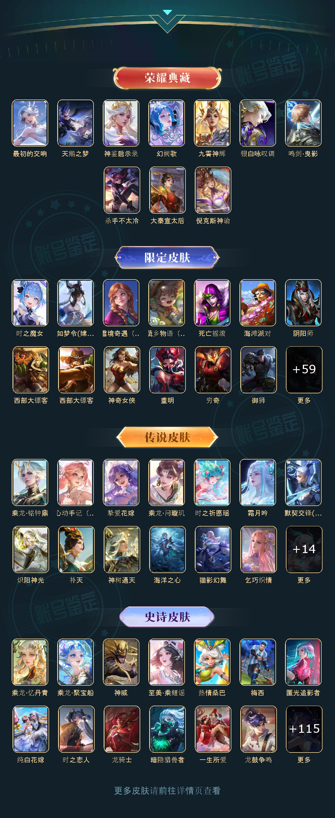 贵族等级V10,英雄数量124,典藏皮肤数9,皮肤数量401,