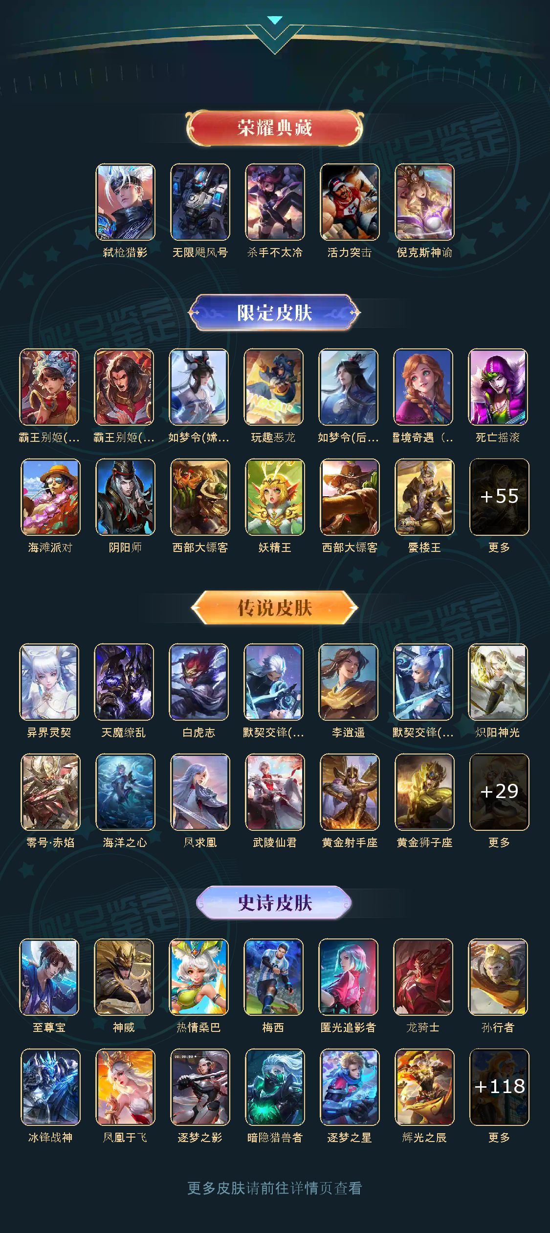 贵族等级V10,英雄数量124,典藏皮肤数4,皮肤数量421,