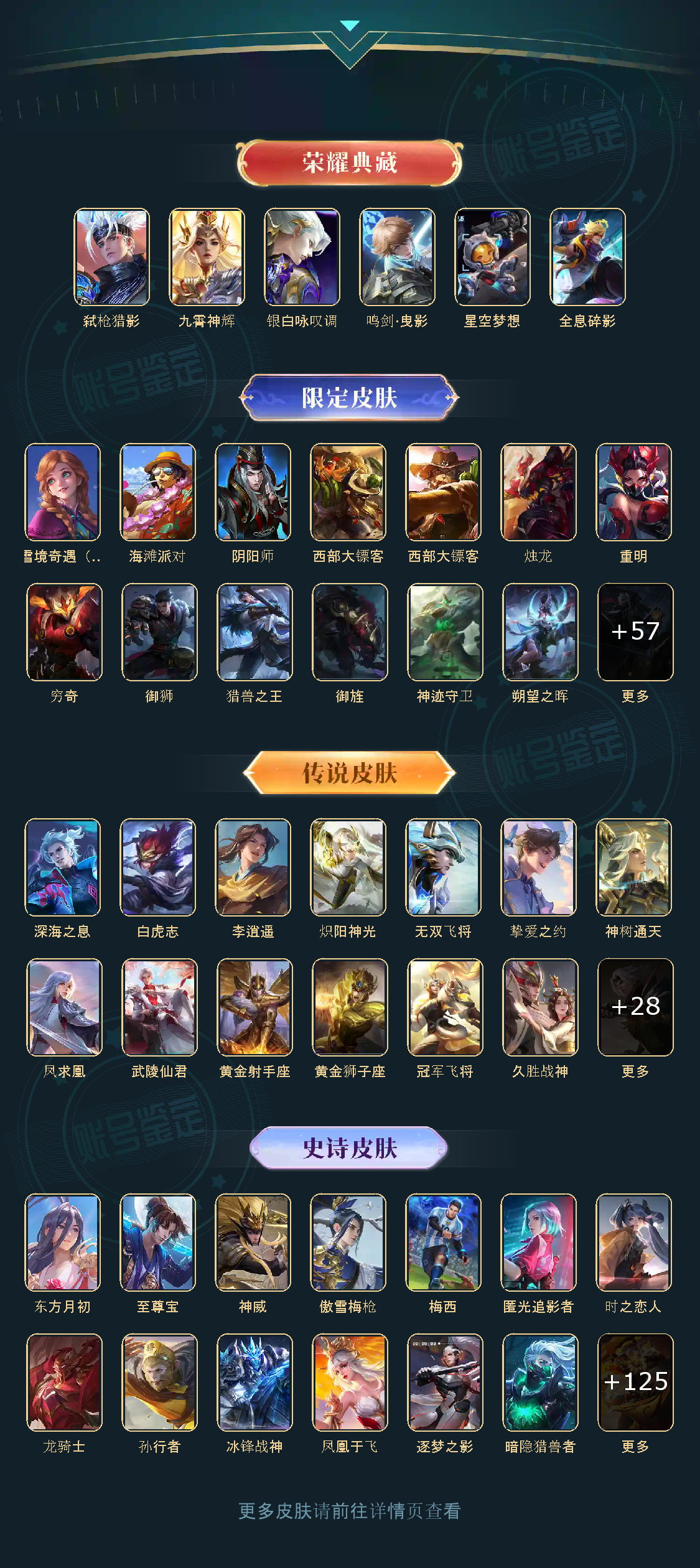贵族等级V10,英雄数量124,典藏皮肤数6,皮肤数量417,星空梦想/全息碎影/鸣剑·曳影
