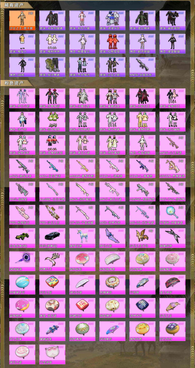 【稀有资产】沙丘之主-图卡盟[3级]/套装-奇异狩猎者/套装-粉红小猪/套装-浪漫天命/套装-雪山精英/套装-暗影哥特/套装-龟仙人/套装-糯粉咩咩/角色-粉雾星云/套装-红熊茄茄/角色-都市丽猫/角色-摩登魅猫/角色-2B战斗服款/套装-狂沙舞者/套装-牛仔情诗/套装-沙丘之歌/M416-仓鼠灰灰