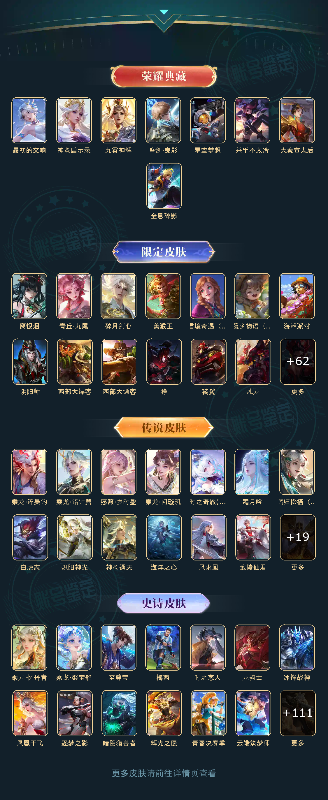 贵族等级V10,英雄数量124,典藏皮肤数8,皮肤数量399,
