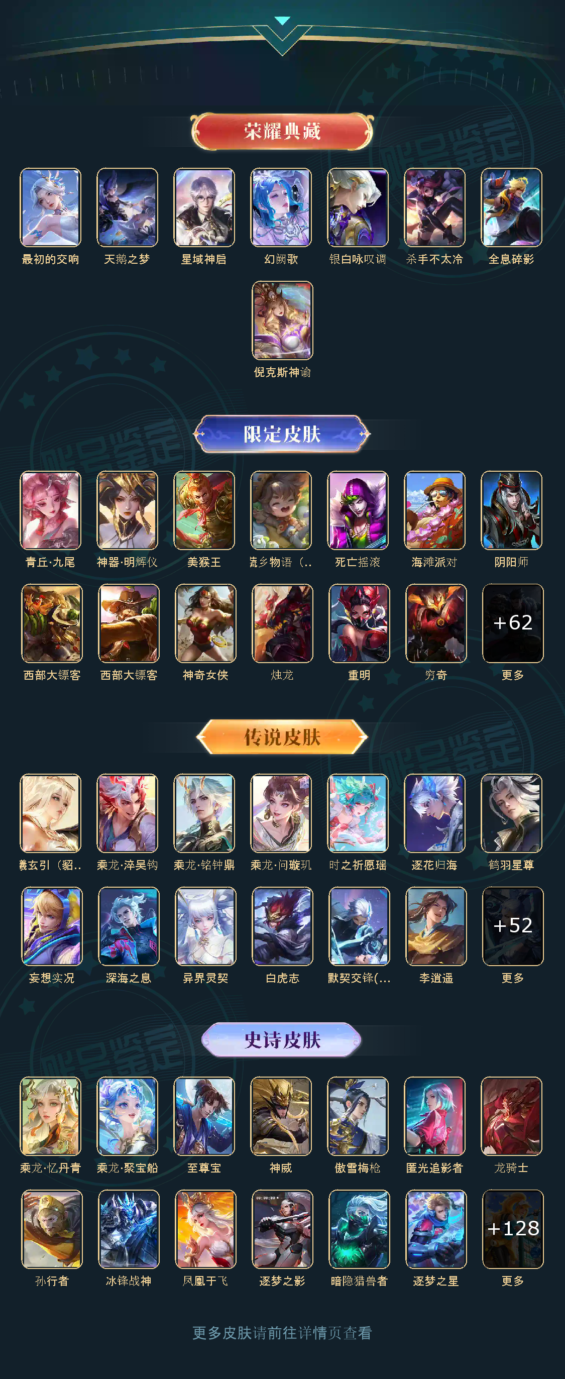 贵族等级V10,英雄数量124,典藏皮肤数8,皮肤数量448,天鹅之梦/全息碎影/倪克斯神谕/星域神启