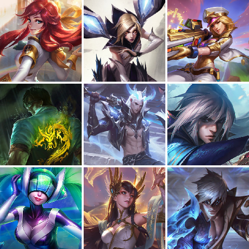 【传说皮肤】幻灵战斗队长厄运小姐 源计划泯灭雷克顿 至尊魔女莫甘娜 黑夜使者索拉卡 神王盖伦 星之守护者阿卡丽 灵魂莲华瑟提 天煞劫 耀星女神拉克丝 源计划超体莫德凯撒 死亡骑士盖伦 光明哨兵薇恩 女警狙击凯特琳 炼狱魔犬内瑟斯 暗星女王拉克丝 战斗学院凯特琳 神龙尊者圣龙李青 女帝卡特琳娜 黎明使者永恩 约德尔国队长提莫 月蚀骑士蕾欧娜 驯龙学者黑默丁格 恶魔男爵瑞兹 黑夜使者亚索 战斗学院伊泽瑞尔 霸天异形卡兹克 战地机甲厄加特 奥德赛凯隐 提莫约德尔人的一大步 神拳李青 腥红之月鬼武姬阿卡丽 冰川巨兽墨菲特 真实伤害艾克 女校长菲奥娜 恶魔之刃泰达米尔 钢铁军团盖伦 血石领主弗拉基米尔 黯晶凤凰艾尼维亚 西部天使艾希 源计划联合艾希 星之守护者霞 大天使长米迦勒凯尔 黎明使者锐雯 陆地王者4WD布里茨 丧尸布兰德 烈焰雄心崔丝塔娜 驯龙炮手崔丝塔娜 绅士科加斯 西部魔影卢锡安 合金巨兽努努和威朗普 律政大亨蒙多 女皇艾希 双重冰晶艾尼维亚 地狱之门卫士加里奥 星之守护者金克丝 屠龙勇士潘森 泳池派对吉格斯 魔幻卡牌崔斯特 最终BOSS维迦 战地巨兽科加斯 铁哥们儿奥拉夫 神王德莱厄斯 宇航员诺提勒斯 鬼魂新娘莫甘娜 符文战熊沃利贝尔 源计划净化薇恩 金牌主播德莱文 银河魔装机神兰博 偶像歌手阿狸 红色男爵库奇 星之守护者拉克丝 电玩女神娑娜 女主播迦娜 灌篮高手德莱厄斯 邪鸦魅影乐芙兰 战场女武神凯尔 黯黑魔龙希瓦娜 第三类接触黑默丁格 枯萎之壤泽拉斯