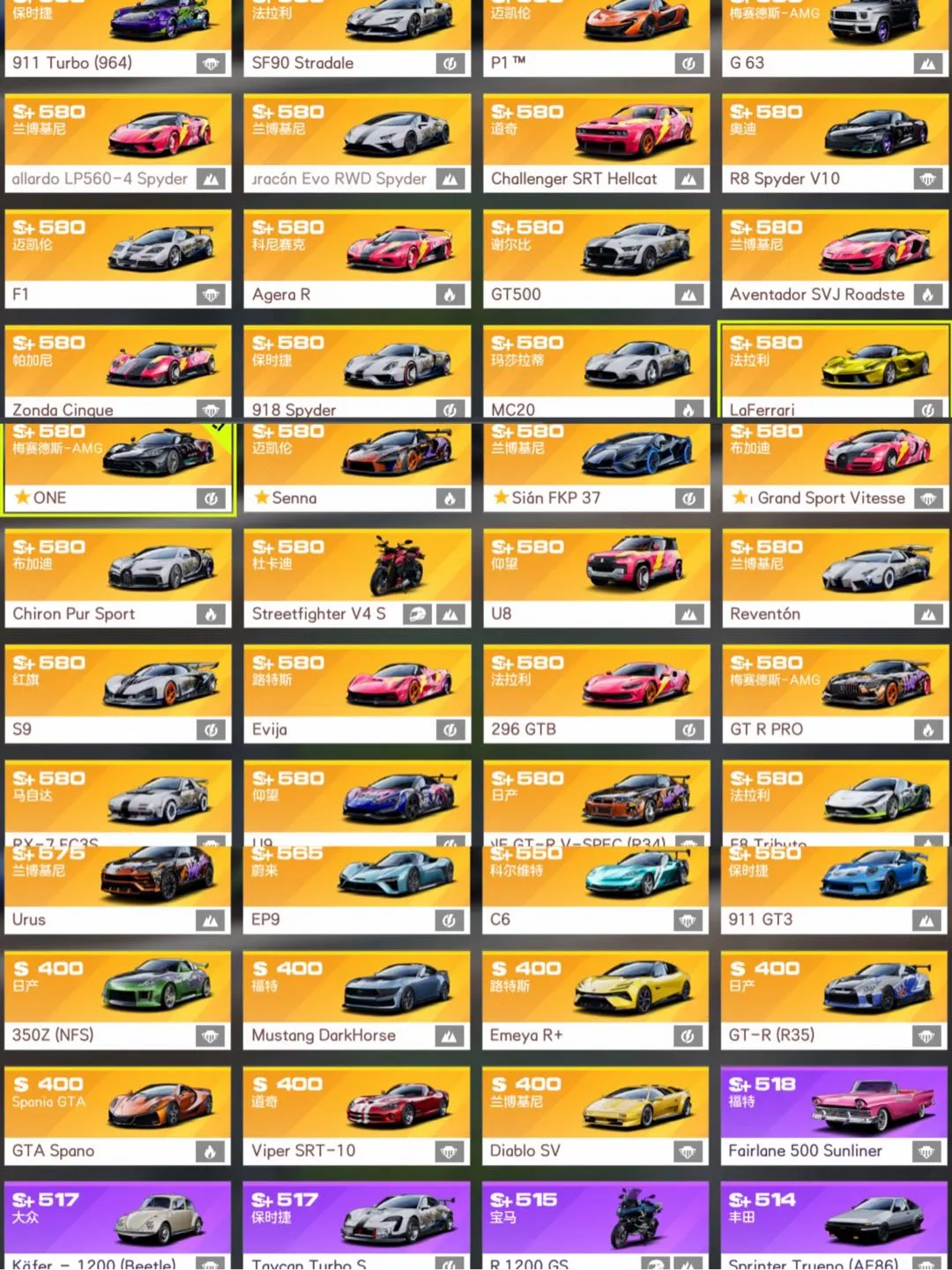 万氪天花板❤️65金车!全组别满改殿堂包天更便宜!AMG*ONE、塞纳、布加迪、闪电套件✨满图鉴-全金车-四传奇涂装南瓜风暴&电力熊仔&最经典涂装涂鸦艺术&山海青龙。衣柜服装拉满:绝版巴黎世家纯黑战神套装❤️传奇限定特效服装甜酷街舞、叛逆街头套装各种限定服装金羽耀阳、JAY绝版套装。
