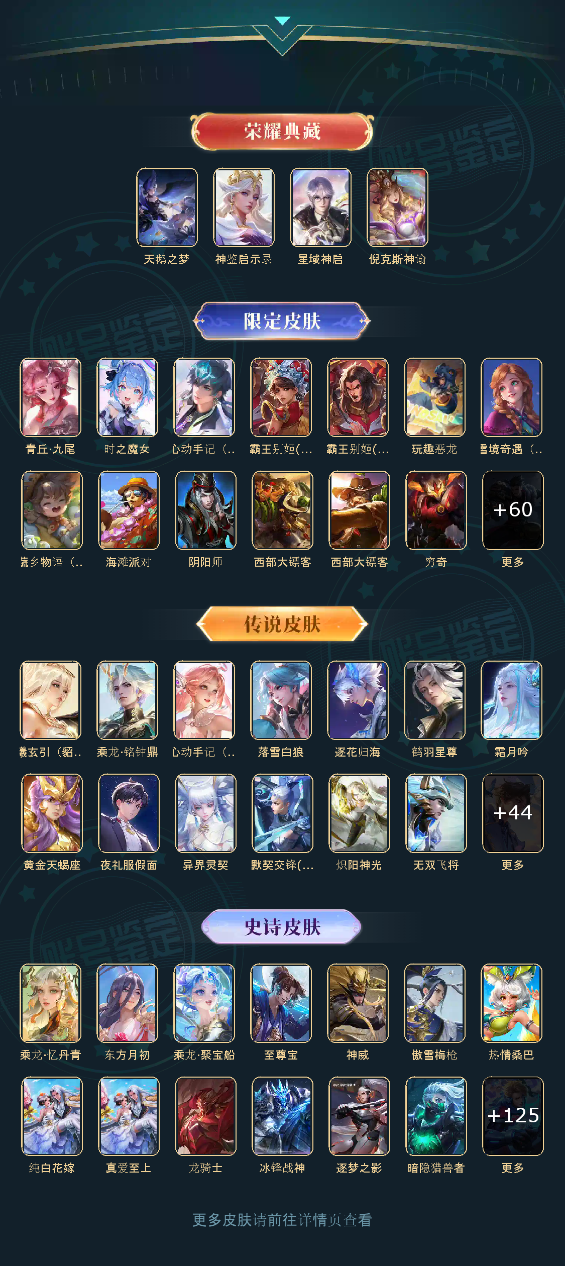 贵族等级V10,英雄数量125,典藏皮肤数3,皮肤数量448,天鹅之梦/倪克斯神谕/星域神启