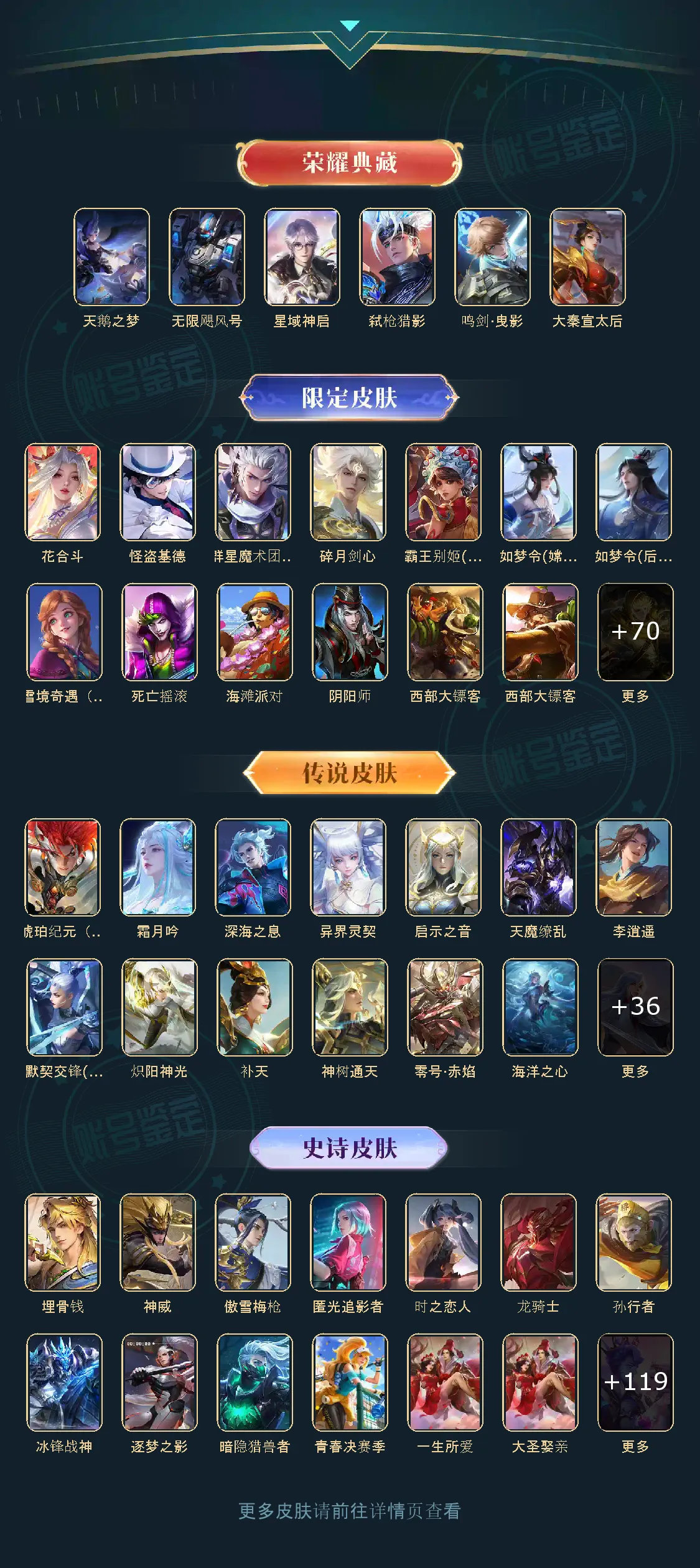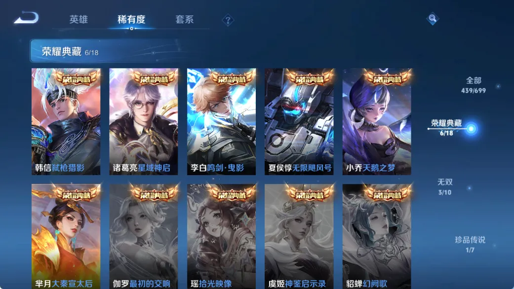 贵族等级V10,英雄数量124,典藏皮肤数6,皮肤数量439,天鹅之梦/大秦宣太后/无限飓风号/鸣剑·曳影/星域神启