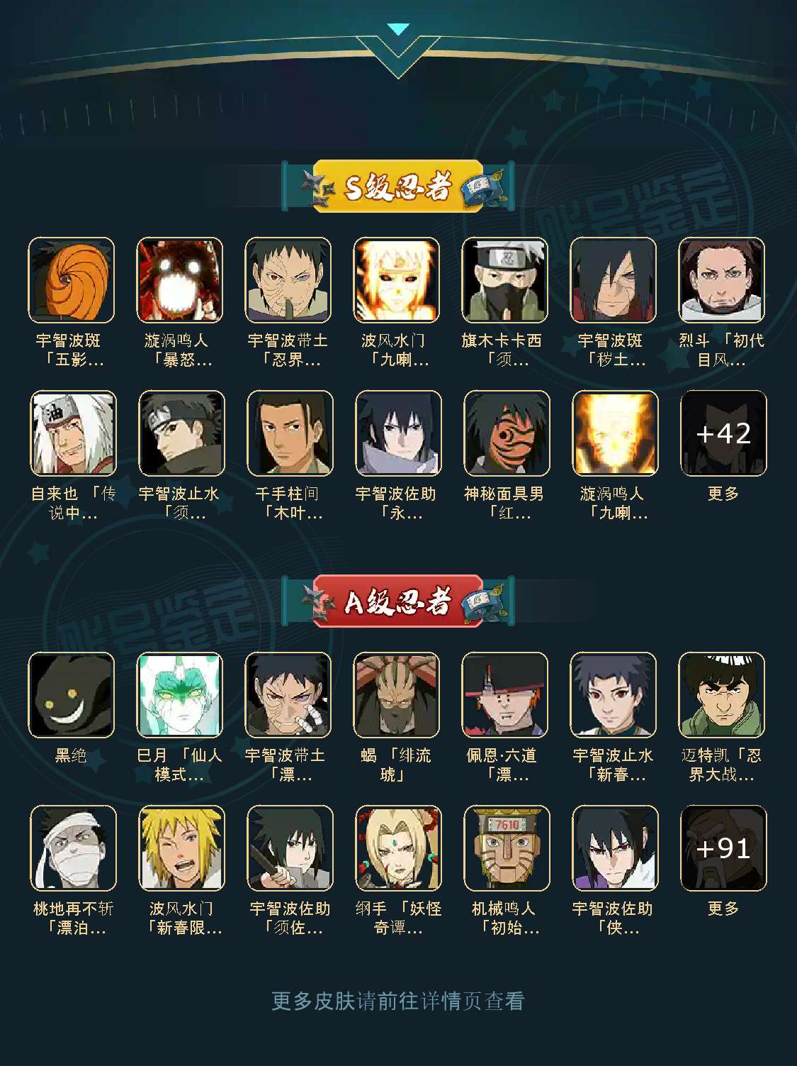 仙人自来也 纲手 波风水门 百战水门 猿飞日斩 千手柱间 宇智波斑 宇智波鼬 舞之自来也 大蛇丸 百战大蛇 秽土四代 秽土三代 秽土长门 仙人兜 黄猿九喇嘛鸣人 紫狗永恒佐助 樱婊忍战樱 秽土鼬 普通自来也 百豪纲手 死门凯 二代扉间 秽土二代 秽土初代 秽土柱间 白面具 须佐卡卡西 小胡子鬼灯幻月 雷影 土影 无 佩恩 百战佩恩 青年柱间 创立初代 秽土斑 青年斑 解斑 须佐止水 虎皮 破面带土 红夜带土 罗砂 秽土三代风影 忍战雷影 三代雷影 金角银角 秽土半藏 忍战大野木 小土豆 天道超 大筒木桃式 大筒木金式 钢铁之躯凯 桀骜之刃阿斯玛 狂野之鲨鬼鲛 飞段 黑飞段 百豪樱 忍战李 大卡卡西 五代水影照美冥 宇智波鼬 仙鸣 九尾查克拉鸣人 鹰佐 奇拉比 青年艾 半蛇兜 晓蛇 新春鼬 面麻 须佐佐助 疾风咒印佐助 忍战宁次 忍战天天 最终章雏田 幻容卡卡西 神卡 忍战卡卡西 泳装卡卡西 忍战凯 青春哥 惊门凯 爱情哥 新春止水 新春水门 青年水门 青水 新春我爱罗 泳装照美冥 侠隐照美冥 侠隐纲手 侠隐兜 漂泊再不斩 漂泊佩恩 漂泊二代 漂泊小南 漂泊佩恩 三船 青年三船 青年长门 泳装南 新春南 新春大蛇丸 晓创生角度 晓创生蝎 晓创生飞段 泳装鼬 鲛肌融合鬼鲛 新春迪达拉 秽土迪达拉 恶灵之影飞段 暴怒带土 忍战黄土 卑留呼 桃博 黑土