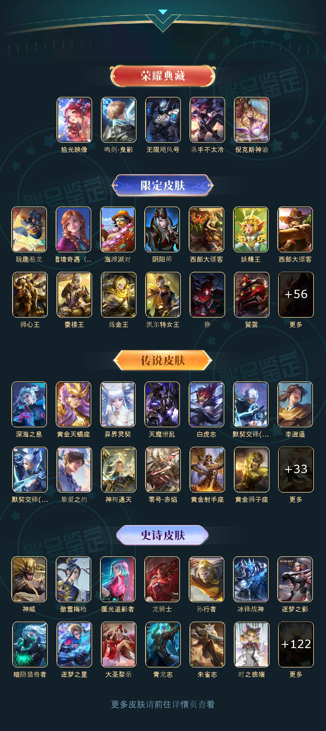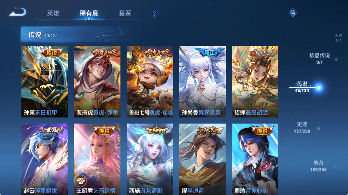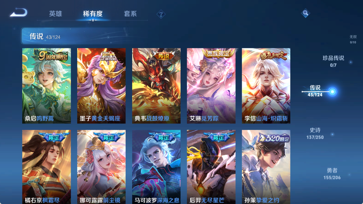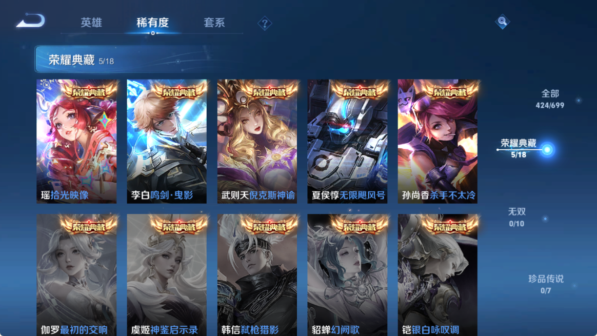 贵族等级V10,英雄数量124,典藏皮肤数5,皮肤数量424,杀手不太冷/无限飓风号/倪克斯神谕/鸣剑·曳影