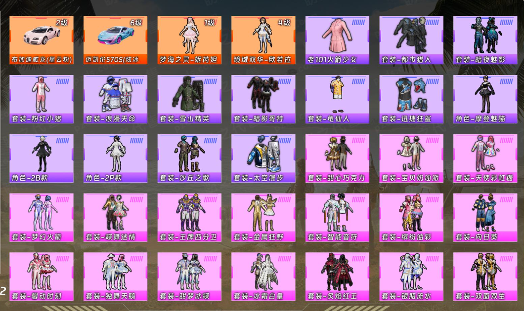 【稀有资产】布加迪威龙(星云粉)[2级]/迈凯伦570S(炫冰蓝)[6级]/梦海之灵-妮芮妲[1级]/镜域双华-欧若拉[4级]/老101火箭少女套装/套装-都市猎人/套装-暗夜魅影/套装-粉红小猪/套装-浪漫天命/套装-雪山精英/套装-暗影哥特/套装-龟仙人/套装-迅捷狂鲨/角色-摩登魅猫/角色-2B战斗服款/角色-2P战斗服款/套装-沙丘之歌/套装-太空漫步