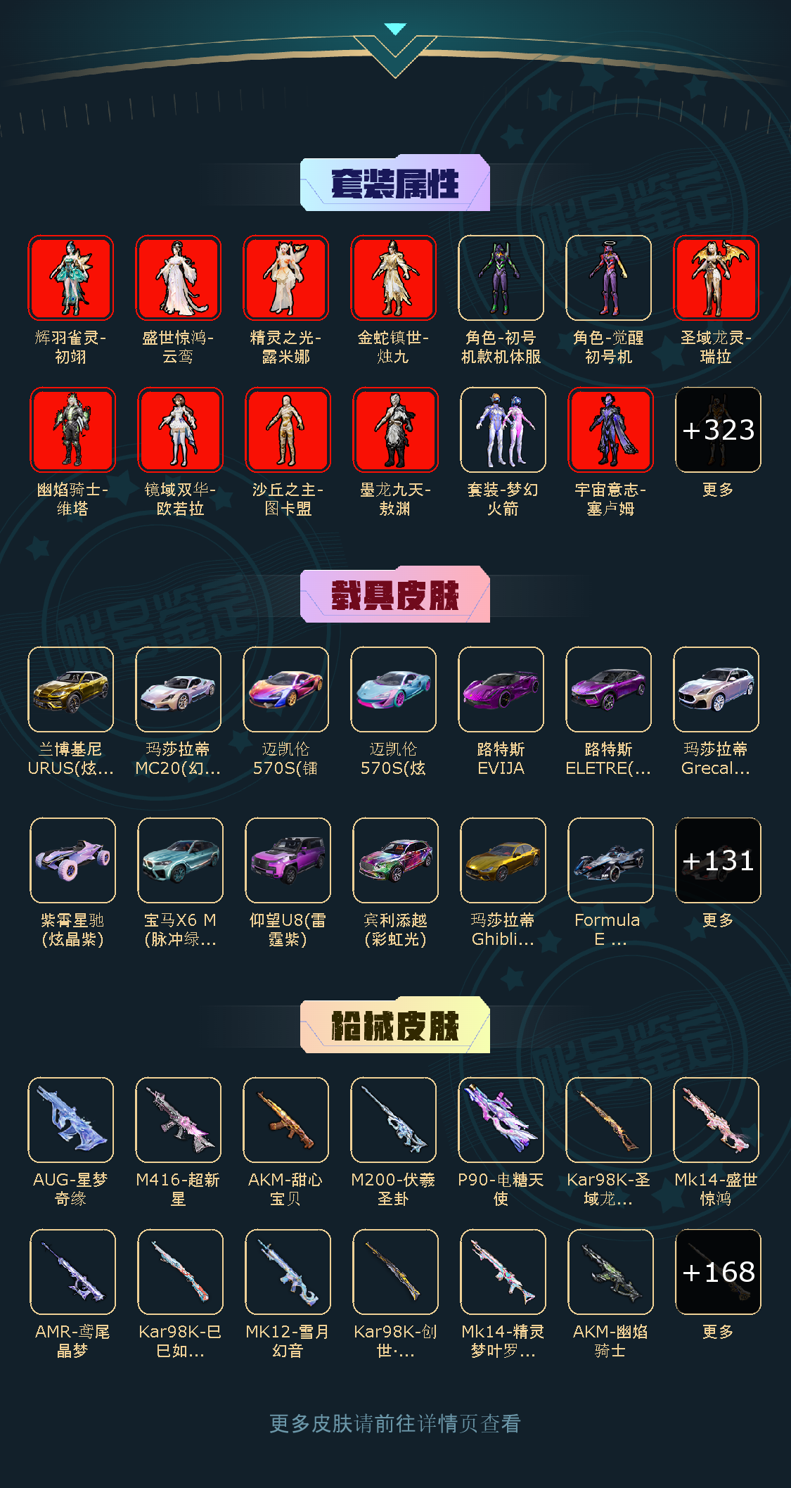 【粉色枪皮】M416-心之恋语[2级]/M762-甜蜜誓约[4级]/AKM-炫紫旋律[5级]/M416-超新星[9级]/AUG-星之彼岸[4级]/M762-甜心娃娃[4级]/Kar98K-巳巳如意[1级]/Kar98K-绿意幻情[4级]/M24-镜域双华[1级]/AMR-炫光之旅[4级]/M200-梦海之灵[3级]/SLR-暗夜玫瑰[3级]/UZI-绮梦青鸾[2级]/UMP45-相思残雪[7级]/Vector-灵感创作师[6级]/汤姆逊-怪笑疯兔[4级]/S12K-海渊国主[3级]/M249-彩虹甜喵[4级]/DP-28-圣堂之誓[4级]/DP-28-枪炮玫瑰[2级]/MG3-洛神天依[4级]