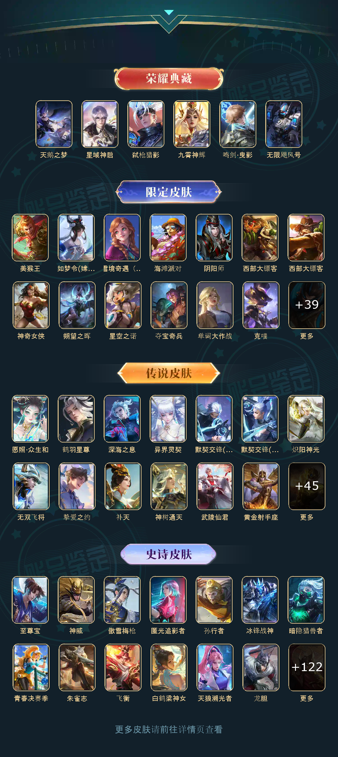 贵族等级V10,英雄数量124,典藏皮肤数6,皮肤数量422,天鹅之梦/无限飓风号/鸣剑·曳影/星域神启
