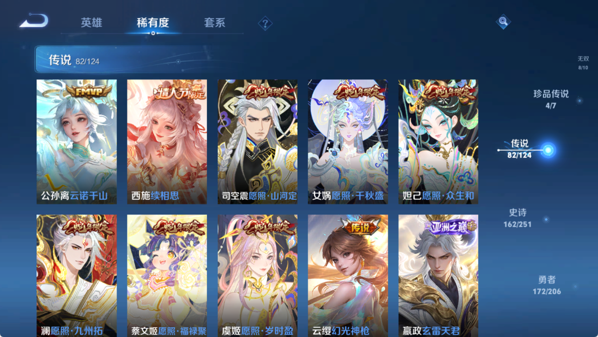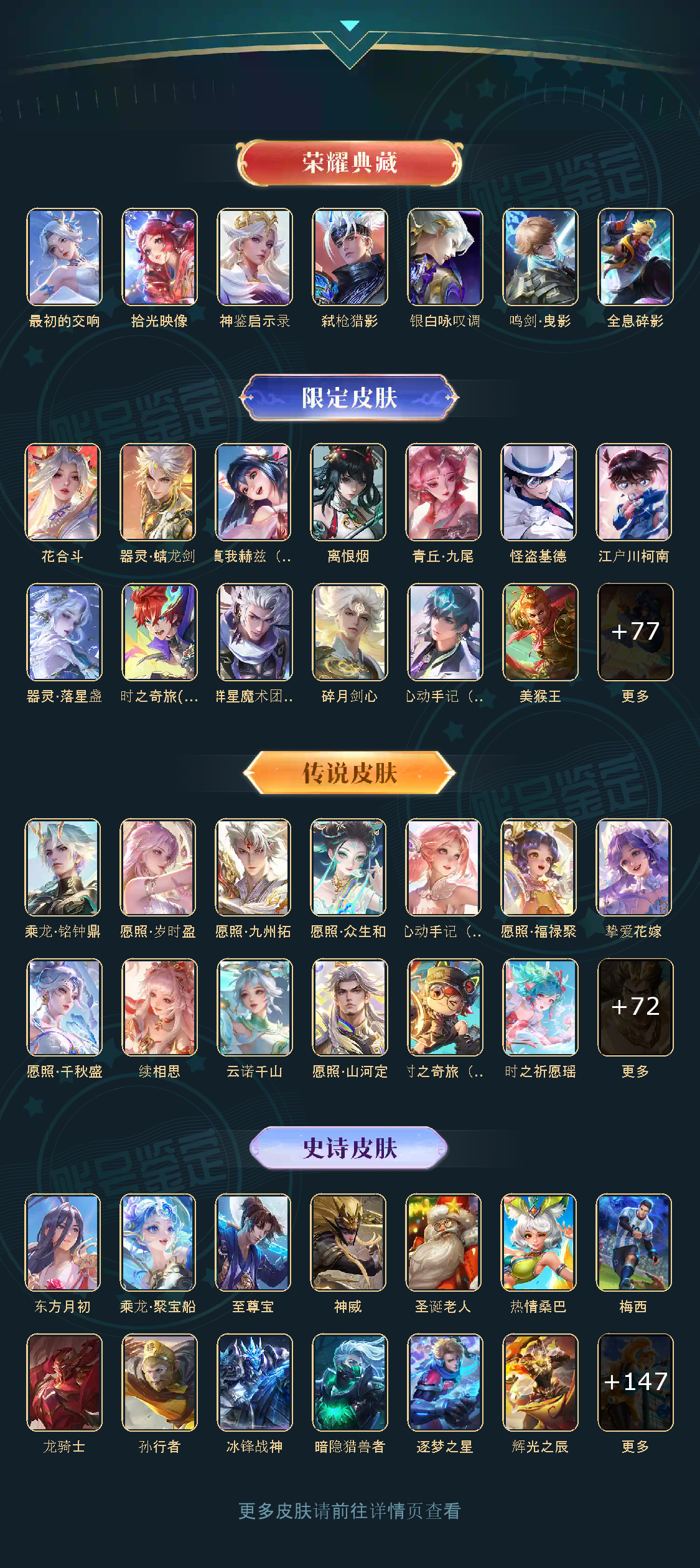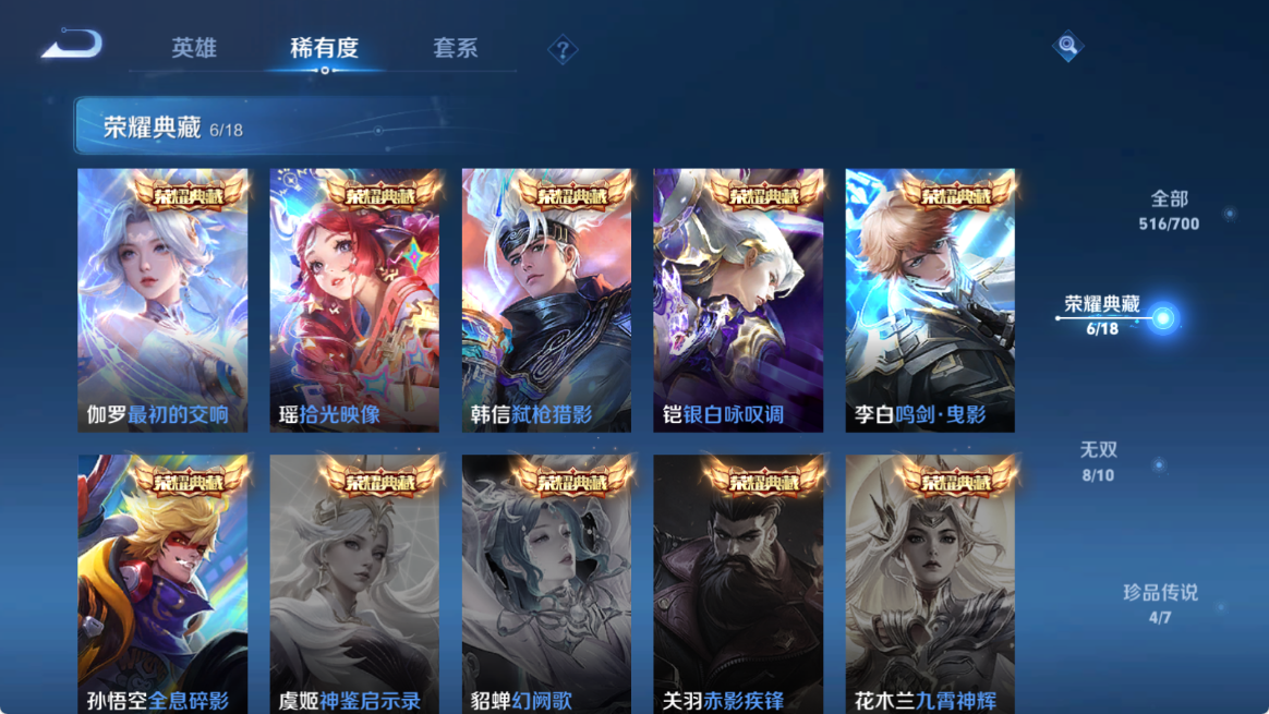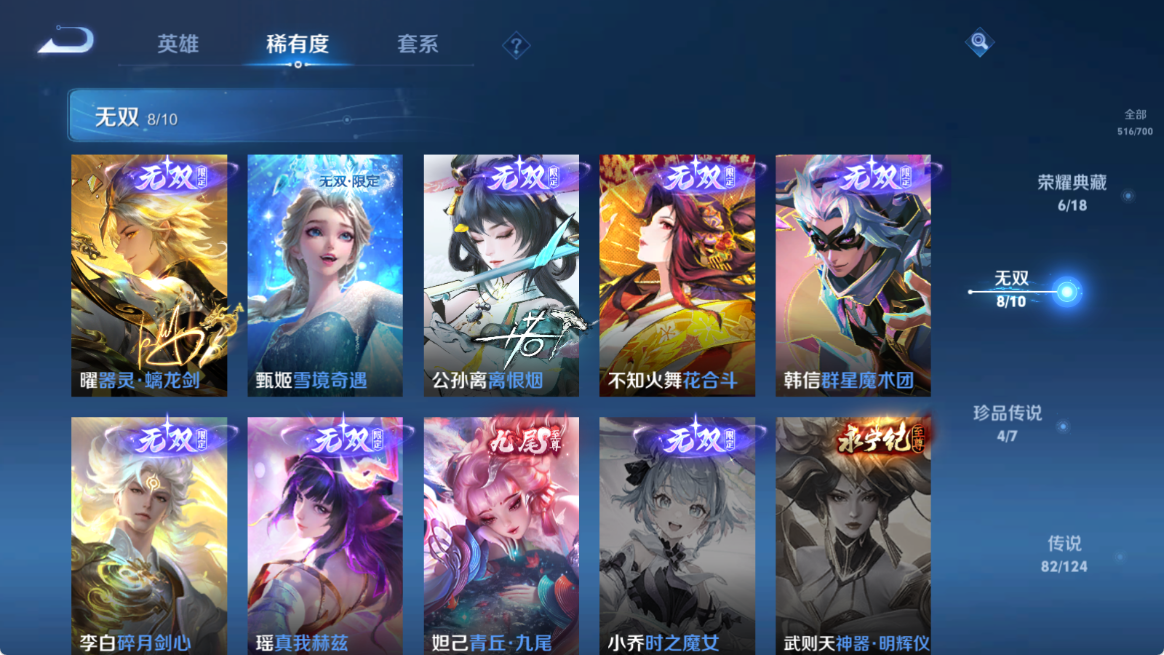 贵族等级V10,英雄数量124,典藏皮肤数6,皮肤数量516,全息碎影/鸣剑·曳影