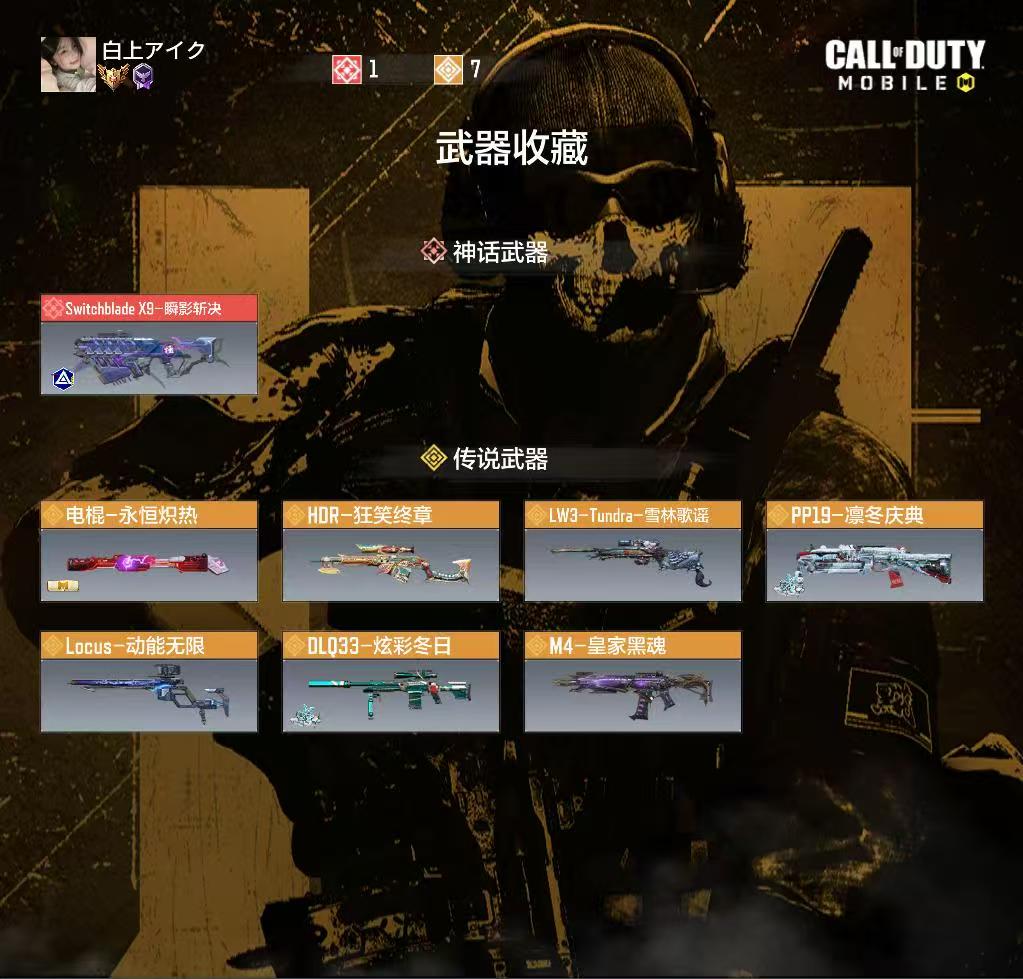 1神话武器,7传说武器,185史诗武器;神话武器:SwitchbladeX9-瞬影斩决;传说武器:M4-皇家黑魂,DLQ33-炫彩冬日,PP19-凛冬庆典,HOR-狂笑终章,Locus-动能无限,电棍-永恒炽热,LW3-Tundra-雪林歌谣