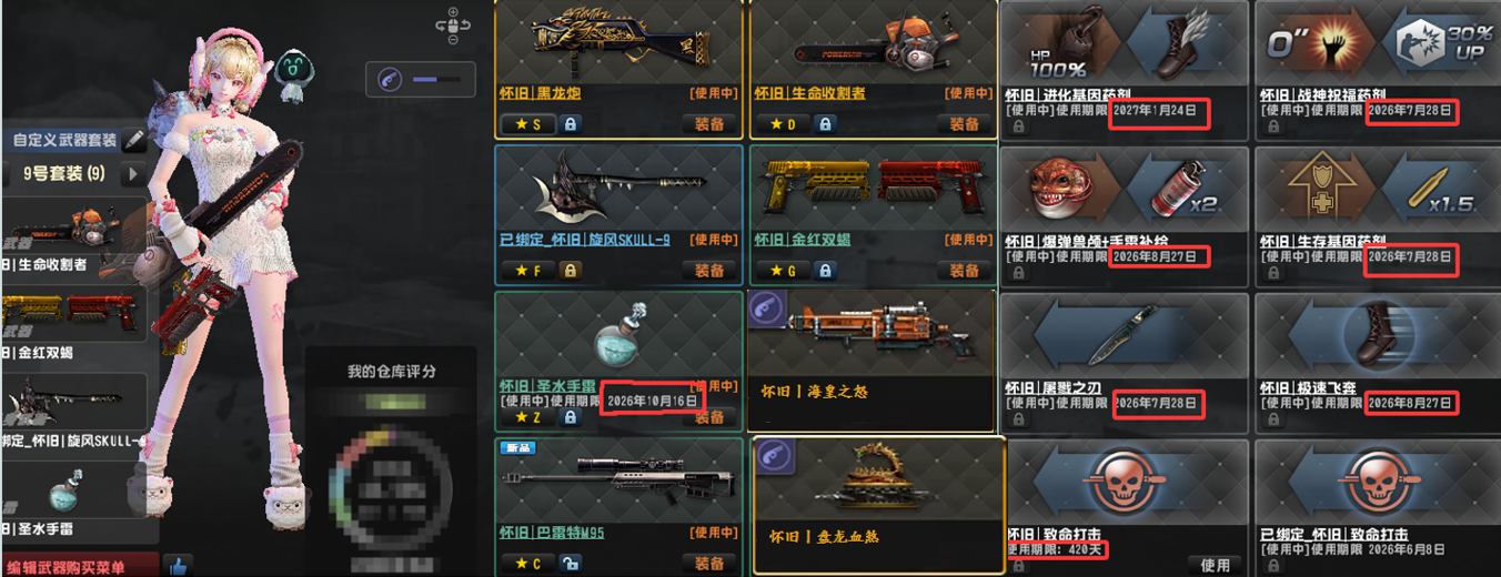 3. 更新:怀旧三件套金红双蝎黑龙炮斧头,+8怀旧圣诞毁灭!生化Z毕业号!四特典:特典加特林,特典狙,特典尖端,特典恶龙炮!全赛季缺第2,5,21赛季悬赏!强化武器全满,主要配件武器6阶,其他最少5阶!已去黑雾!
