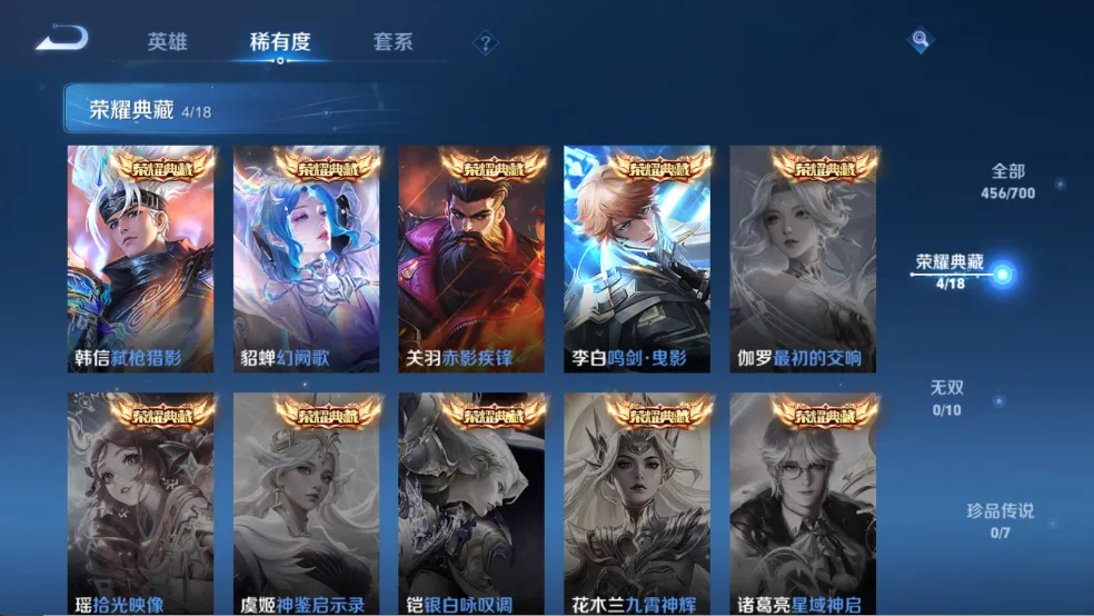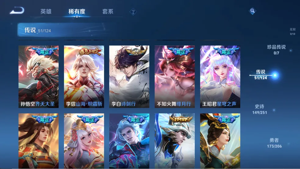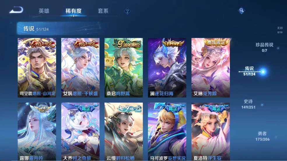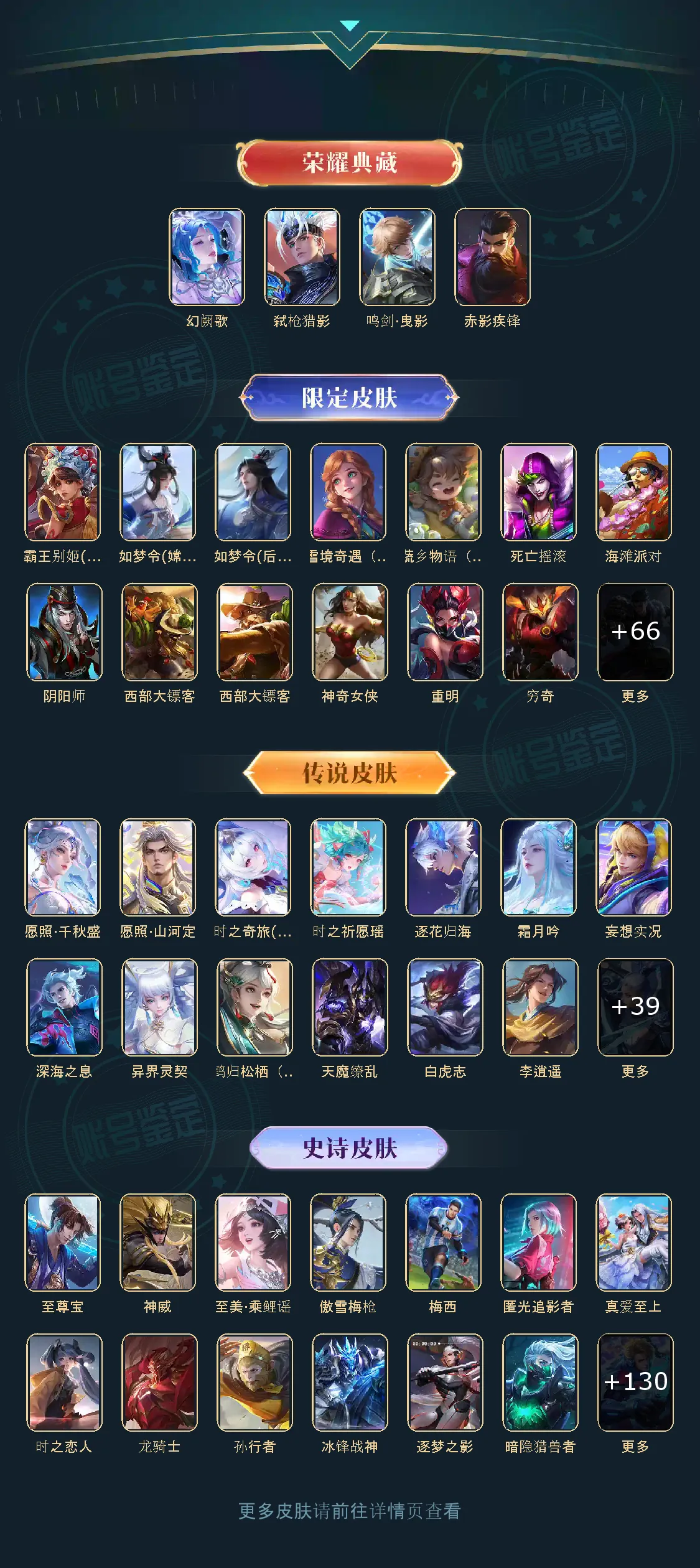 贵族等级V10,英雄数量124,典藏皮肤数4,皮肤数量456,冰锋战神街头霸王天魔缭乱至尊宝真爱至上凤求凰逐梦之影武陵仙君神奇女侠梅西黄金狮子座大圣娶亲冰霜恋舞曲青龙志白虎志朱雀志太华久胜战神飞衡梁祝匿光追影者鸣剑·曳影李逍遥武圣奔雷神使孙行者玉兔公主补天异界灵契神威傲雪梅枪时雨天司