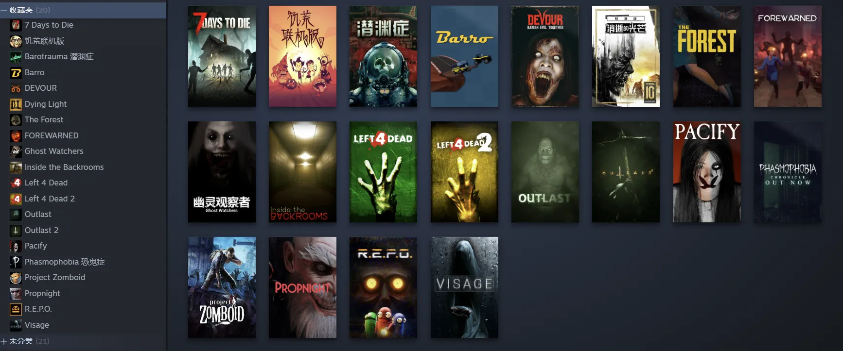 REPO、黎明杀机(Dead by Daylight)、恐鬼症/幽灵恐怖(Phasmophobia)、道具夜/道具之夜(Propnight)、吞噬(DEVOUR)、安抚(Pacify)、潜渊症(Barotrauma)、消逝的光芒增强版(Dying Light Platinum Edition)、深入后室(Inside The Backrooms)、幽灵观察者(Ghost Watchers)、预警(FOREWARNED)、面容(Visage)、逃生1(Outlast)、逃生2(Outlast 2)、僵尸毁灭工程(Project Zomboid)、7日杀/七日杀(7 Days to Die)、求生之路1,求生之路2(Left 4 Dead, Left 4 Dead 2)、饥荒联机版(Don't Starve Together)、迷失森林(The Forest)