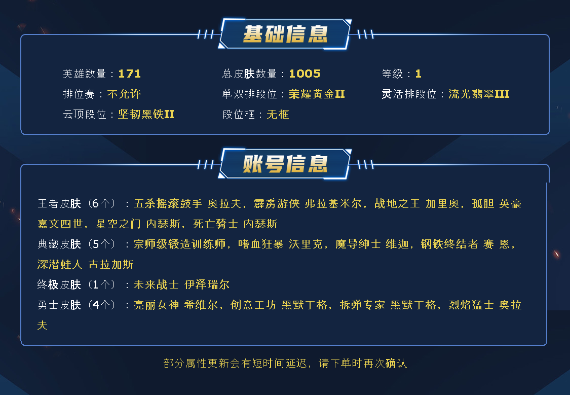 希望各位兄弟珍惜爱护此号,素质游戏,大家千万不要挂机逃跑,当成自己号来玩,输成什么样号主都能接受,如果故意逃跑或挂机肯定拉黑!【重要皮肤】T1杰斯至臻 幻灵战斗猫金克丝至臻 未来战士卢锡安至臻 灵魂莲华提莫至臻 源计划阴劫至臻 KDA阿狸至臻 KDA阿狸2022至臻 源计划正义艾瑞莉娅至臻 源计划正义艾瑞莉娅2022至臻 绒毛菲兹至臻 海克斯科技嘉文四世 恐惧新星德莱厄斯 胜利女神娑娜 舞会公主安妮 创星之灵璐璐 荣誉使者玛尔扎哈 电玩女神厄运小姐 电玩勇者锐雯 电玩女神阿狸 星之守护者伊泽瑞尔 女帝格温 玉剑传说无劫 玉剑传说翼剑仙 点心宝贝阿木木 龙的传人李青 天龙之子黛安娜 天龙之子迦娜 天龙之子卡莎 天龙之子李青 天龙之子伊泽瑞尔 天龙之子易 剪纸仙灵艾瑞莉娅 龙腾虎跃瑟提 替父从军花木兰 神龙烈焰金克丝 你看见过我的熊猫吗安妮 北辰之威内瑟斯 南天之怒沃里克 紫金罗刹莫甘娜 广寒仙子嫦娥 张辽文远 司马懿仲达 金猪烈焰瑟庄妮 胜利女神奥莉安娜 觅心游侠卢锡安 觅心之翼奎因 觅心萝莉金克丝 觅心猎手薇恩 寒冬精灵璐璐 圣诞捣蛋鬼金克丝 圣诞老人布隆 圣诞老人德莱文 冰雪风暴希维尔 狂心冰王图奇 冰雪女神辛德拉 魄罗骑士瑟庄妮 夺命美人卡特琳娜 平安夜女神娑娜 圣诞糖果棒厄运小姐 魅惑女巫艾尼维亚 魅惑女巫迦娜 魅惑女巫厄运小姐 魅惑女巫莫甘娜 魅惑女巫奈德丽 死亡誓约卡特琳娜 死亡誓约劫 灵魂收割者索拉卡 海之歌奈德丽 海之歌萨勒芬妮 泳池派对厄运小姐 泳池派对菲奥娜 泳池派对李青 泳池派对雷克顿 泳池派对瑟提 御星魔矢艾希 送披萨的小姐姐希维尔 克格汪 制胜金靴李青 DRX亚托克斯 DRX凯特琳 EDG厄斐琉斯 EDG佛耶戈 EDG格雷福斯 EDG悠米 EDG佐伊 DWG蕾欧娜 FPX李青 iG卡蜜尔 iG洛 iG卡莎 iG艾瑞莉娅 iG乐芙兰 iG菲奥娜 SSG伊泽瑞尔 SKTT1扎克 SKTT1娜美 SKTT1艾克 SKTT1奥拉夫 SKTT1瑞兹 SSW锤石 SSW泰隆 SSW图奇 SSW辛吉德 SKTT1贾克斯 SKTT1劫 SKTT1婕拉 SKTT1李青 暗杀星蒙多 暗杀星努努和威朗普 暗杀星伊泽瑞尔 暗杀星慎 Fnatic迦娜 Fnatic古拉加斯 Fnatic卡尔萨斯 冰雪节格雷福斯 冰雪节玛尔扎哈 冰雪节辛吉德 防暴士兵格雷福斯 防暴士兵辛吉德 防暴天使凯尔 钢铁之翼艾尼维亚 冠军典狱长锤石 冠军之刃锐雯2016 冠军之隐劫 鬼影森森茂凯 鬼影重重魔腾 海贼瑞兹 红桃杰克崔斯特 胡桃夹子萨科 惊悚派对费德提克 警用试作体K9内瑟斯 蓝色忧郁崔斯特 蒙多蒙多 密林猎手提莫 南瓜头费德提克 女猎手希维尔 圣诞精灵崔丝塔娜 圣诞开心鬼提莫 圣诞狂欢基兰 圣诞狂欢努努和威朗普 圣诞老人古拉加斯 圣诞玩偶波比 圣诞驯鹿克格莫 糖果使徒费德提克 外星装甲库奇 卧虎藏龙贾克斯 无头骑士赫卡里姆 喜庆之树茂凯 邪恶圣诞老人维迦 幸福女神乐芙兰 雪默丁格 雪装奈德丽 野兽猎人德莱文 野兽猎人瑟庄妮 野兽猎人泰达米尔 英勇玩具兵普朗克 勇者阿狸 勇者奈德丽 征服者卡尔玛 征服者诺提勒斯 暗影沃里克 机械迷城加里奥 诺斯费拉图弗拉基米尔 阿木木主人不要我了 波比的巧克力工坊 都铎王朝图奇 十五周年纪念希维尔 十周年纪念安妮 暗裔英雄盖伦 未来战士伊泽瑞尔