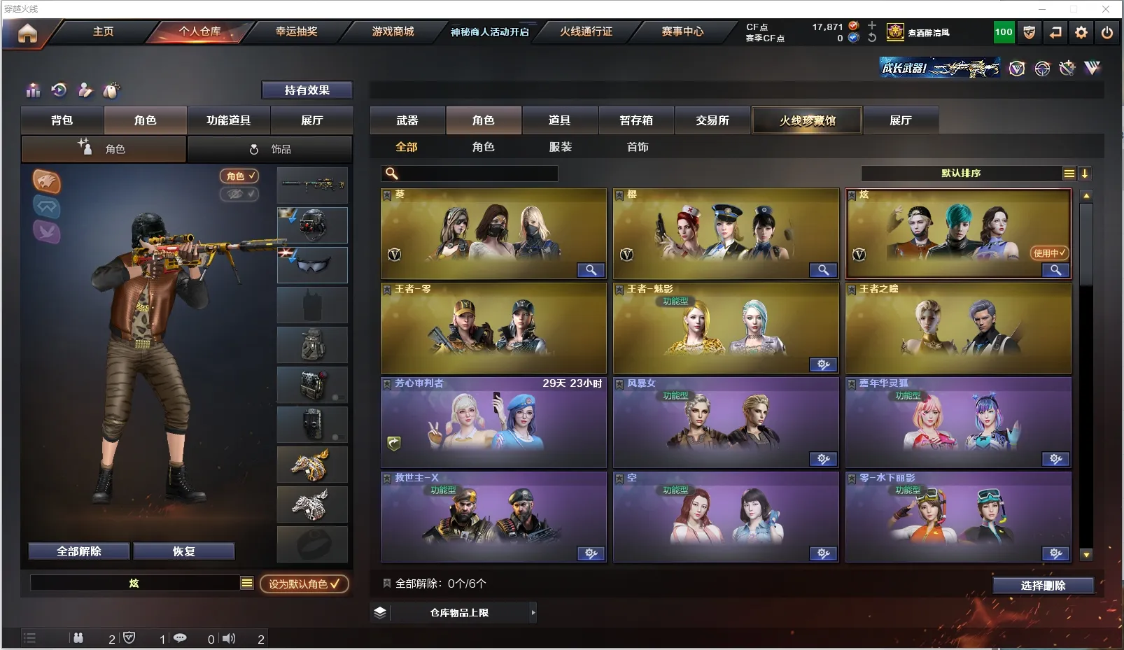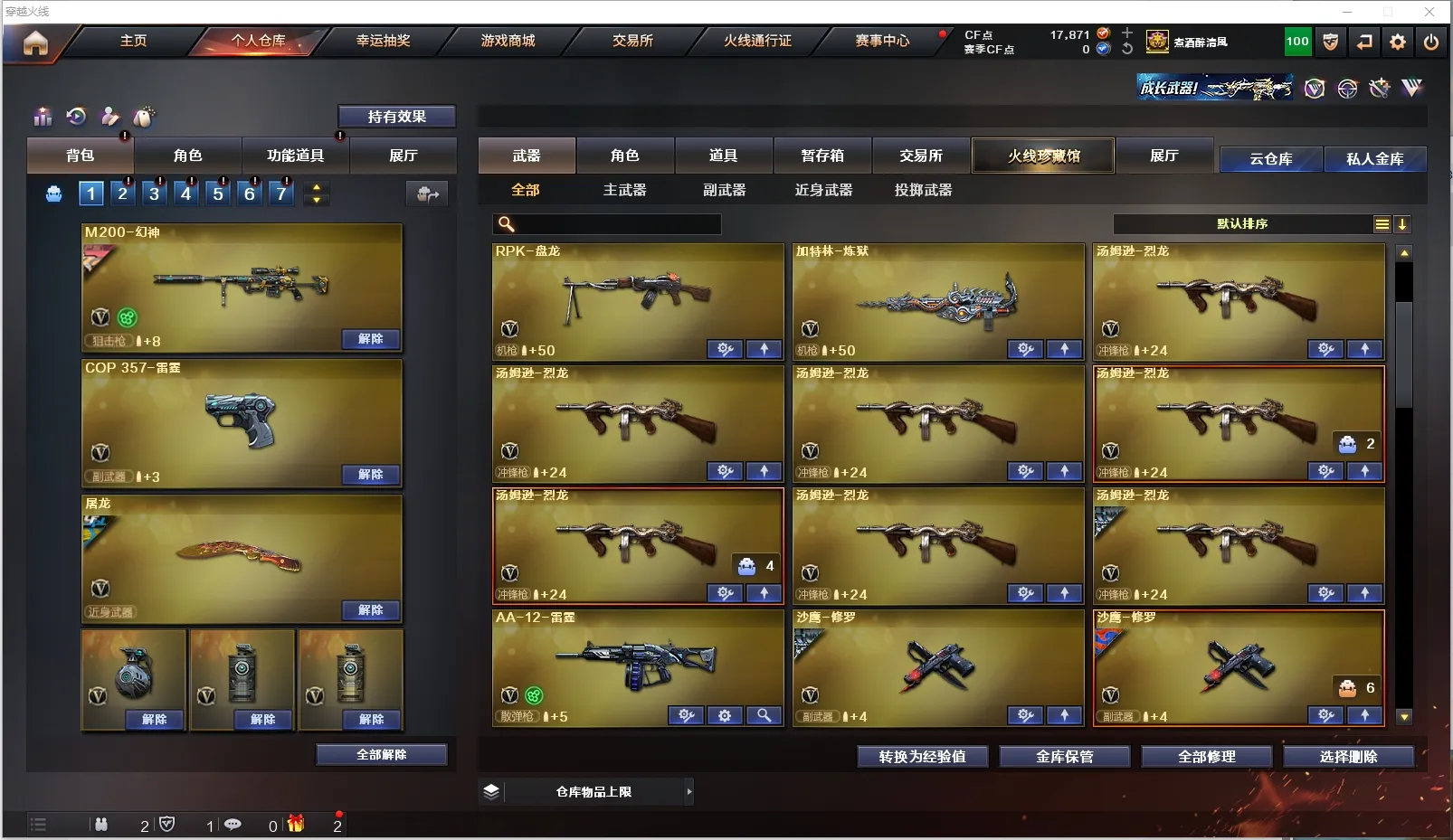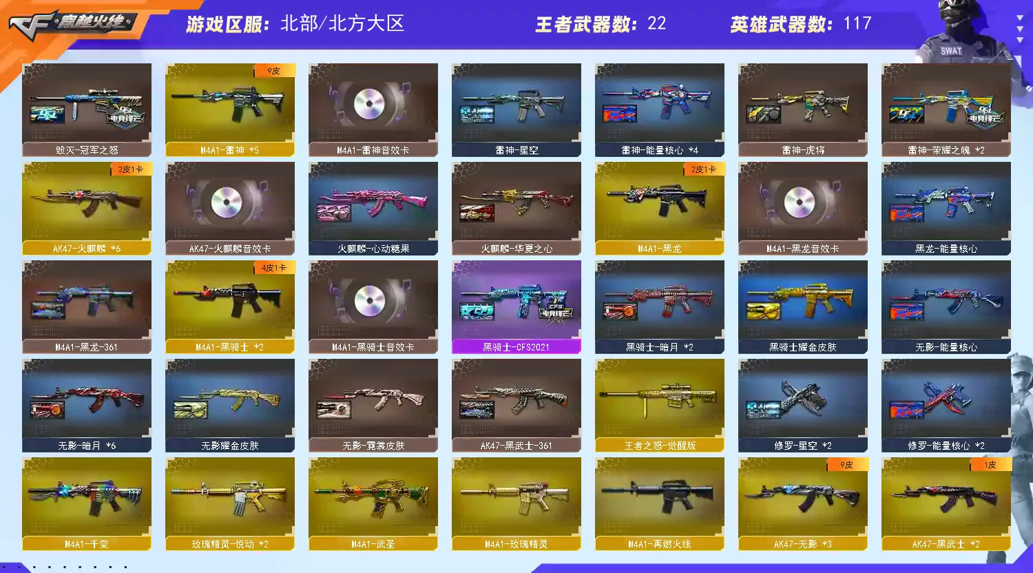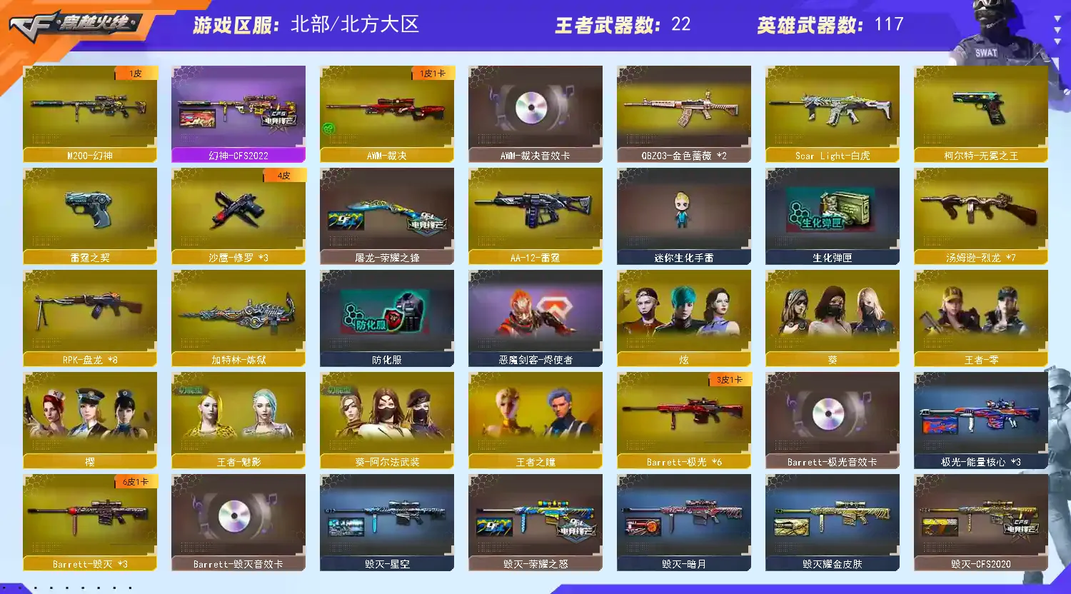 【主 武】:幻神(CFS2022)、6烈死亡之眼、6盘炼狱、白虎、千变、火麒麟X6、黑龙(361)、雷神X5(荣耀之魄)、黑骑士X2(CFS2021)、无影X2(霓裳)、死神(秘银)、黑骑士X2(361)、天启(暗月)、超新星X2、武圣、机械迷城、黑鲨X5、龙血、玫瑰精灵、QB金色蔷薇X2、烈火、天龙(70kg)、毁灭X3(CFS2022)、激光X6(能量核心)、裁决、冰龙粉碎者-白马银枪、死亡之眼、激光毁灭者3、AA12擎天柱3、金魔等各种活动武器