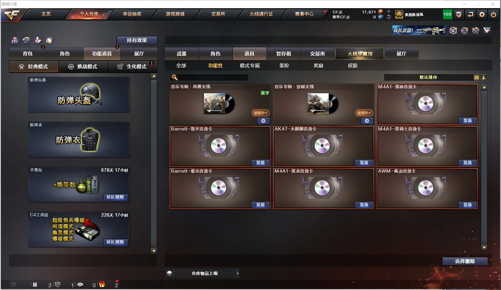 【道 具】:雷神音效卡、毁灭音效卡、火麒麟音效卡、黑骑士音效卡、激光音效卡、黑龙音效卡、裁决音效卡、兔女郎玩偶、7个背包、超级背包、炫彩背包、AC(防弹衣+防弹头盔)、C4工具钳、手雷包、挑战弹夹、夺命之镰、变异宝贝、灵魂忍者、生化弹夹、防化服、机枪弹夹、冲锋枪弹夹、散弹枪弹夹、手枪弹夹、狙击枪弹夹、步枪弹夹、减少停顿包