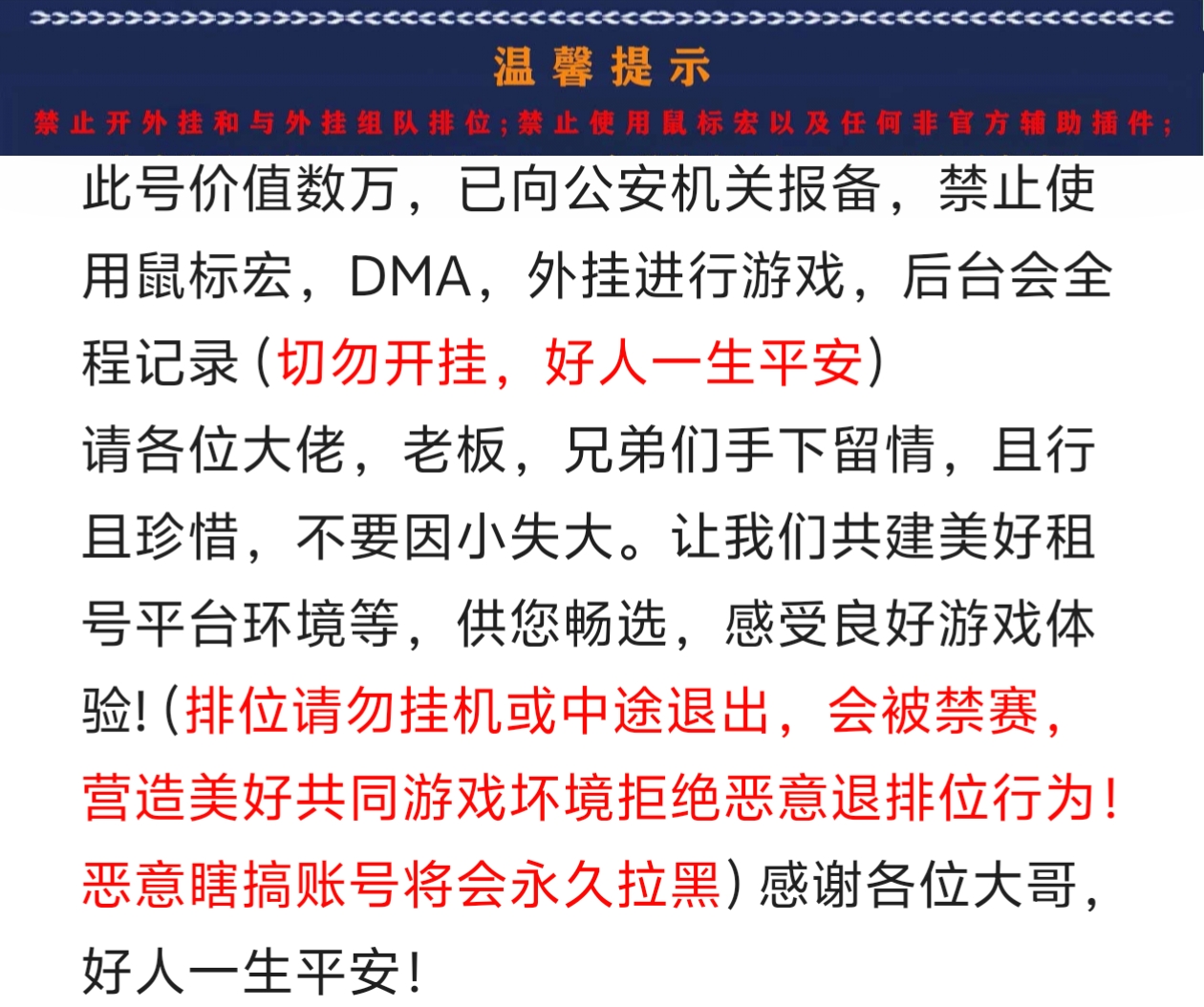 请各位大佬,老板,兄弟们手下留情,且行且珍惜,不要因小失大。让我们共建美好租号平台环境等,供您畅选,感受良好游戏体验!(排位请勿挂机或中途退出,会被禁赛, 营造美好共同游戏坏境拒绝恶意退排位行为!恶意瞎搞账号将会永久拉黑)感谢各位大哥,好人一生平安!